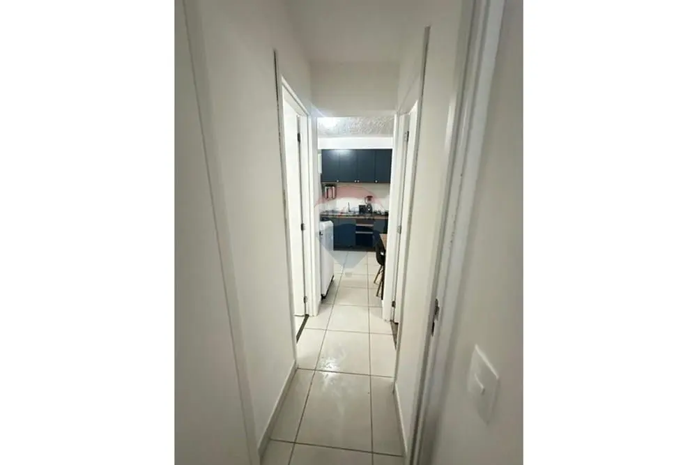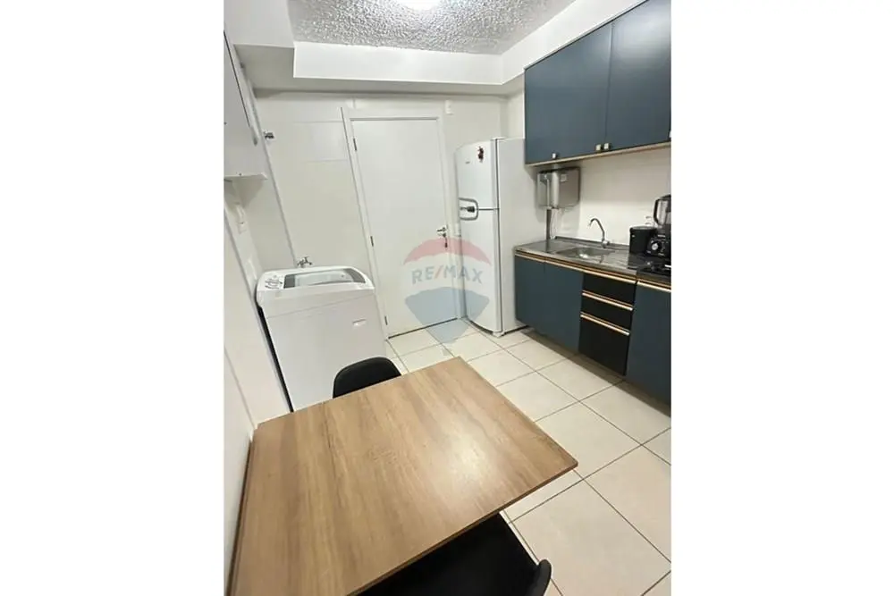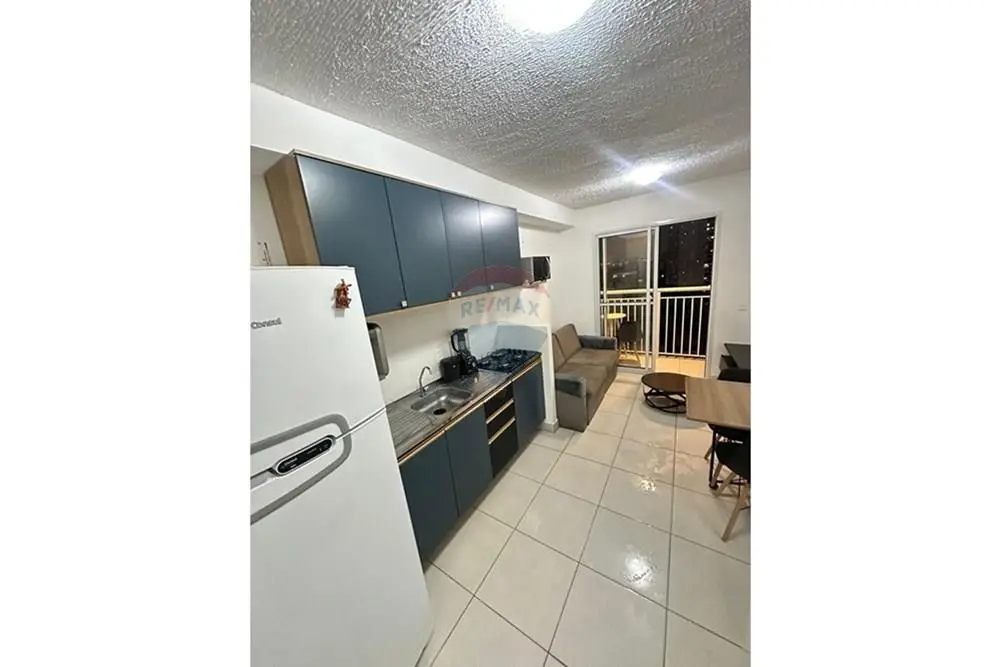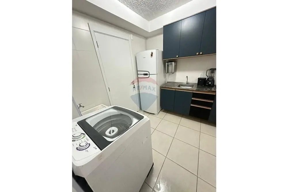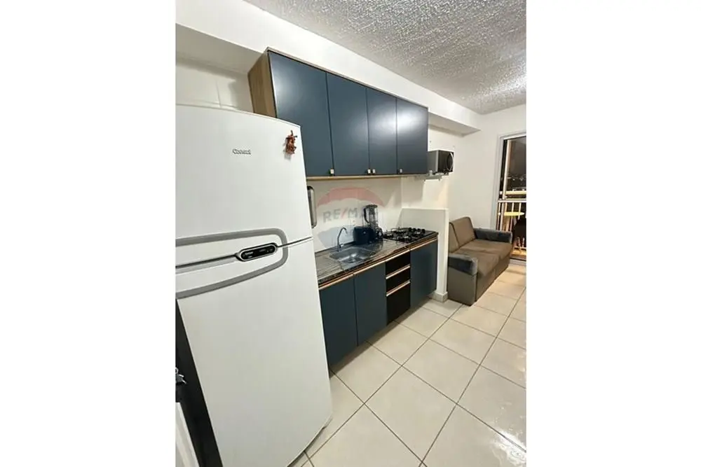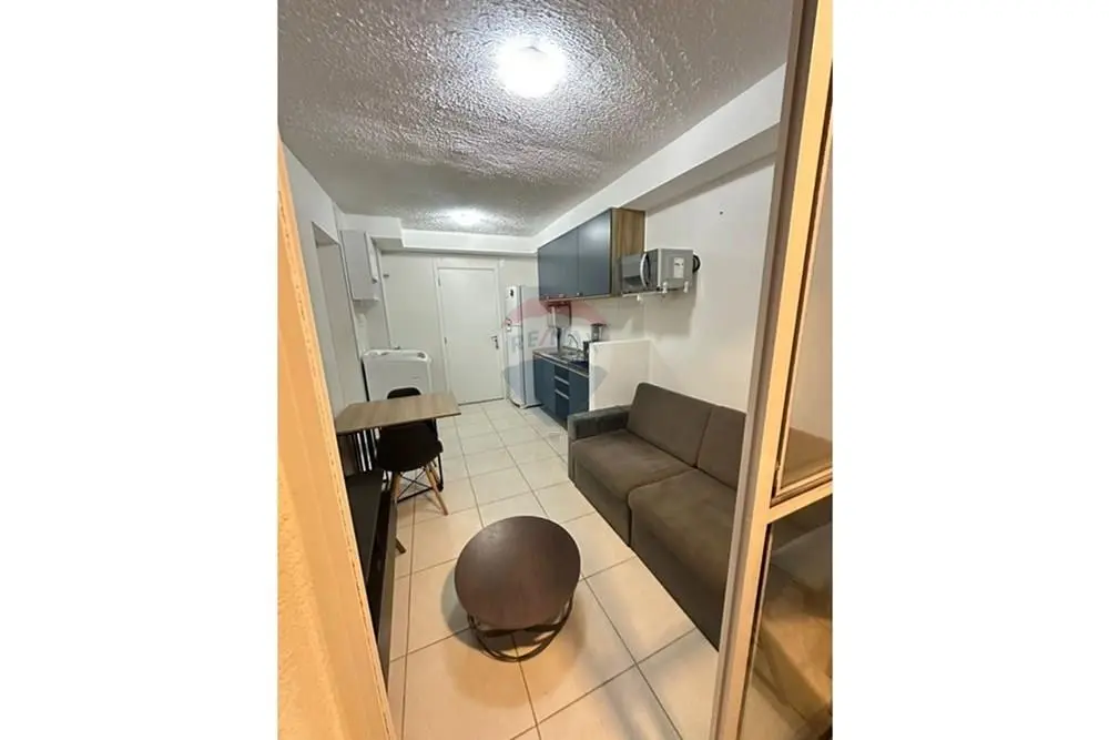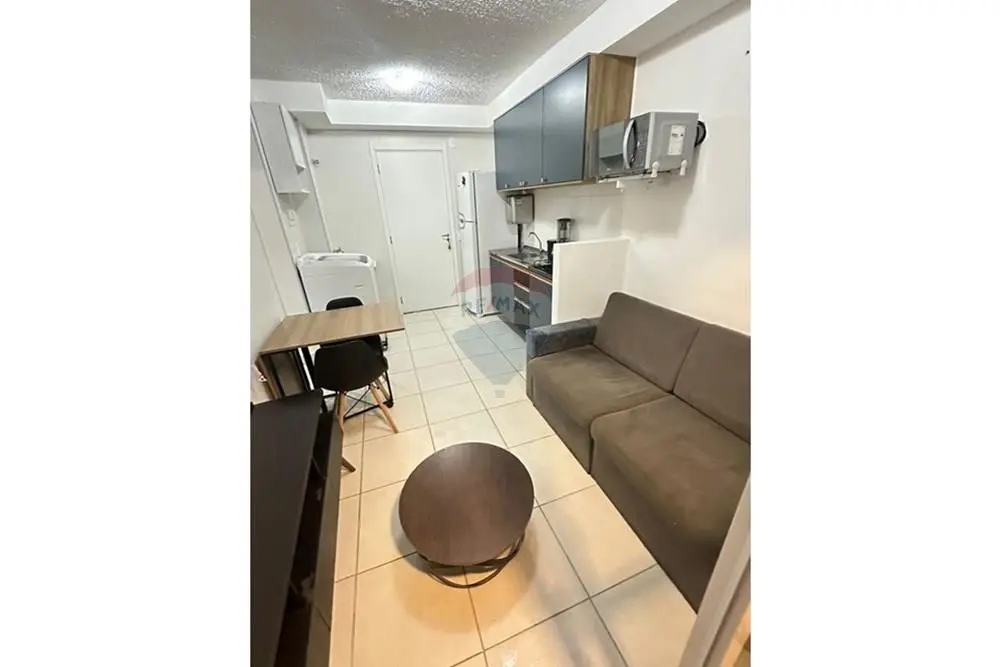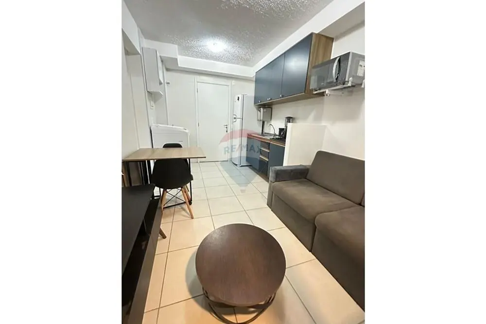 O imóvel conta com sala equipada com sofá de dois lugares, mesa de centro e rack/home baixo com nichos e gavetas. Cozinha com armários, geladeira, micro-ondas, cooktop e máquina de lavar roupa.