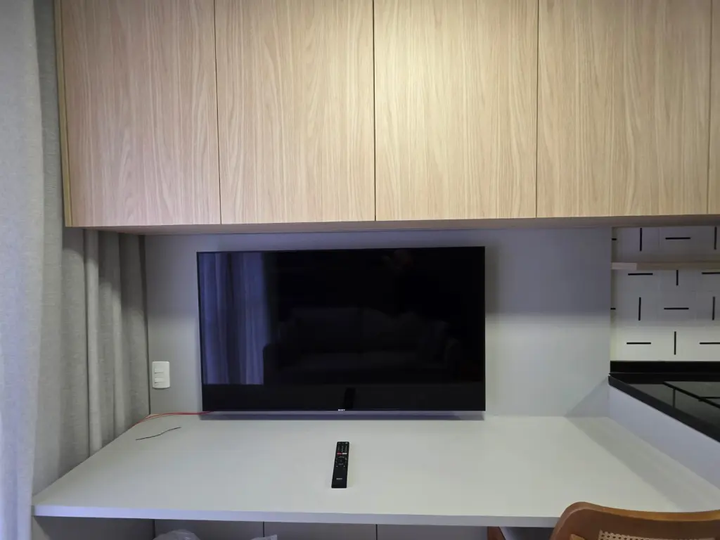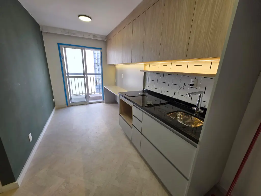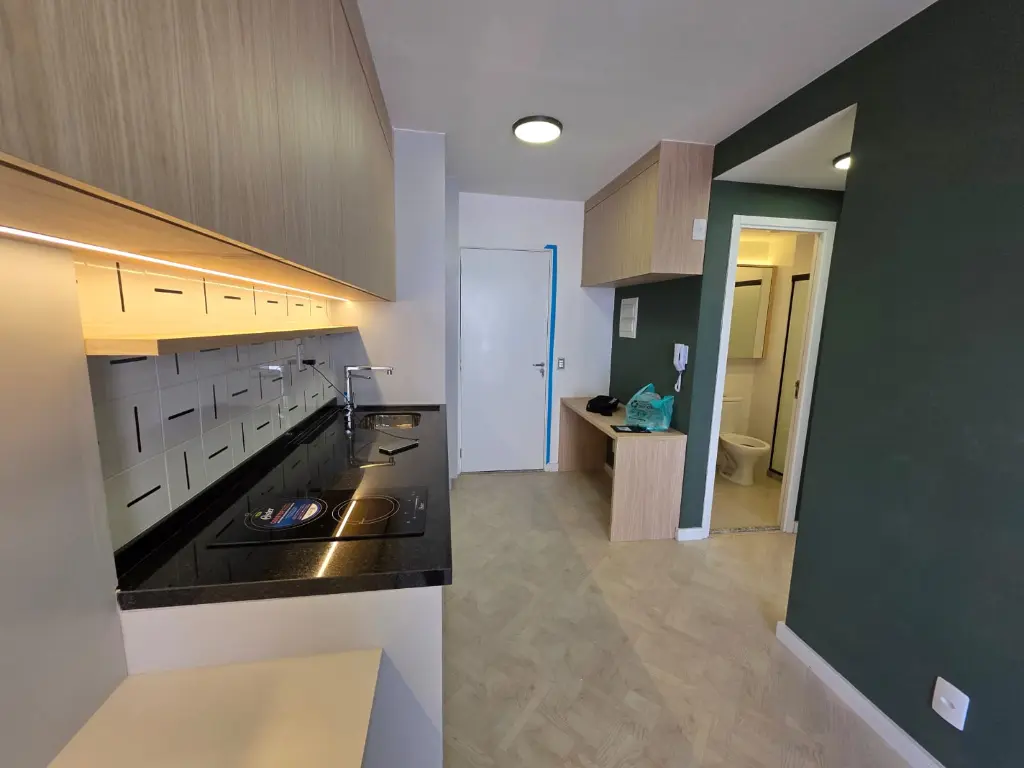 Sala e cozinha integradas, ambas com armários.