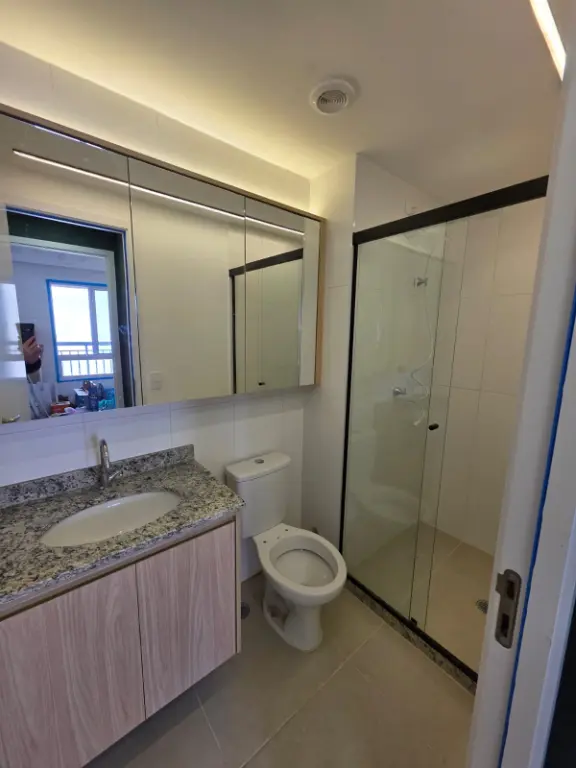 Banheiro com armário espelhado, gabinete e box.