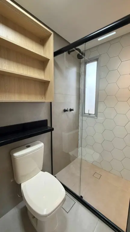 ? 1 banheiro moderno com armário, box e ponto de água quente/fria também na pia