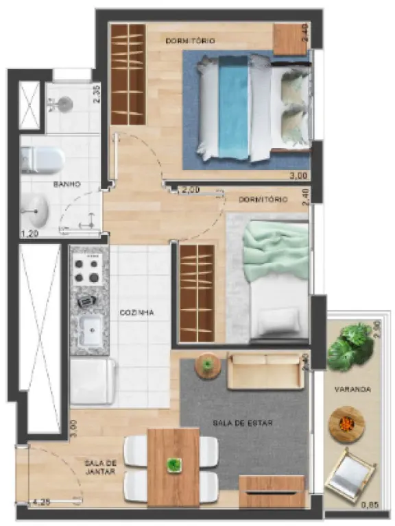Planta Inteligente: Área privativa de 36,68m², ideal para solteiros ou casais que priorizam a facilidade no dia a dia.