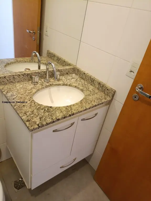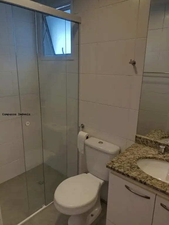Aquecimento à gás. Banheiro com box e gabinete de pia.