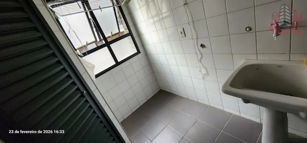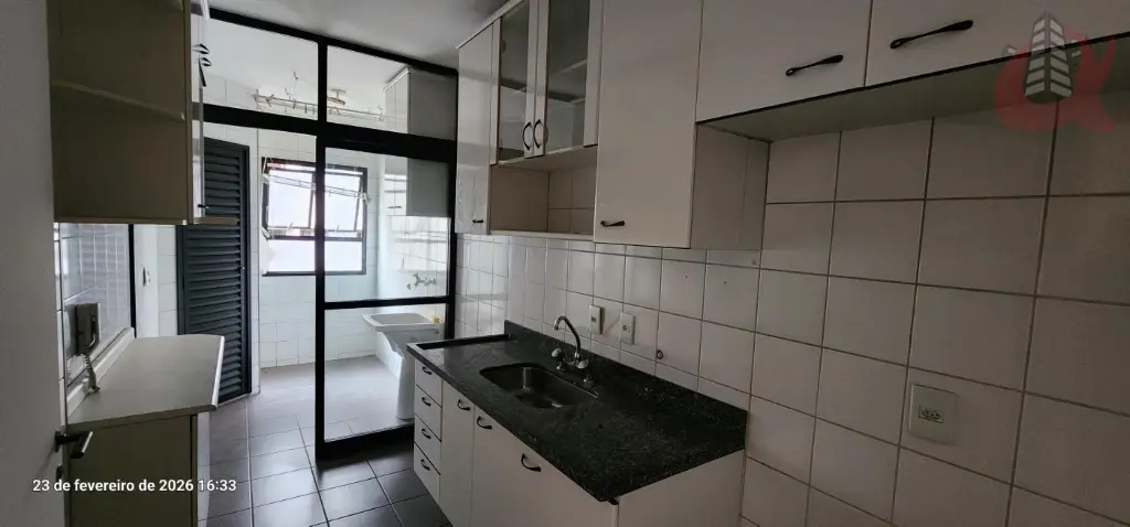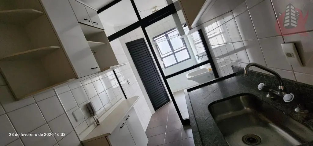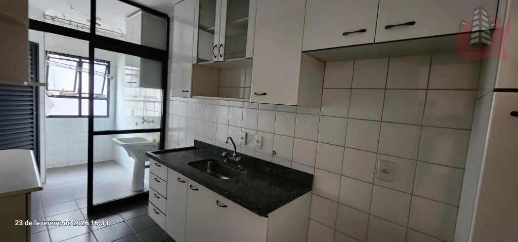 Cozinha fechada com janela ampla na lavanderia. Repleto de armarios. Divisoria entre cozinha e lavanderia. Banheiro de Serviços na lavanderia.