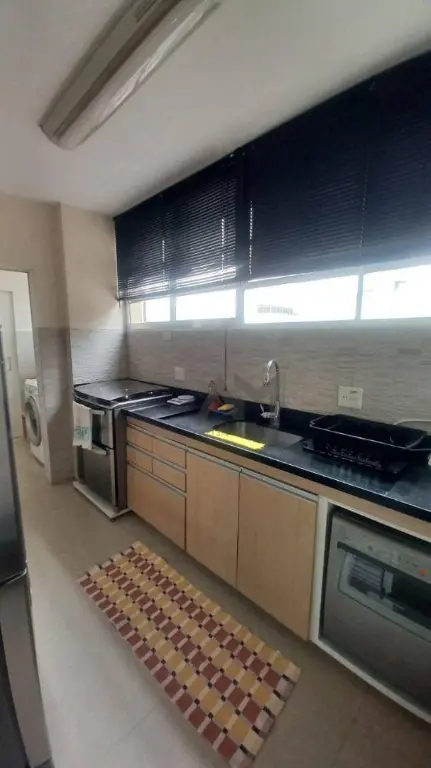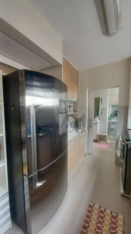 Cozinha completa, equipada com armários embutidos e geladeira.