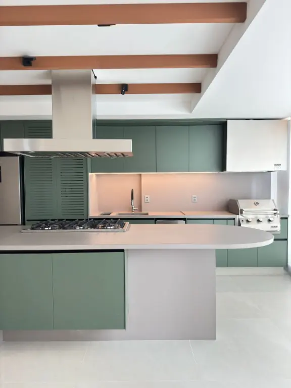 O apartamento é mobiliado e apresenta acabamentos de qualidade, incluindo piso porcelanato e móveis planejados. A cozinha é integrada, criando um ambiente contemporâneo e acolhedor. Adicionalmente, o imóvel oferece água quente, ar-condicionado central, elevador privativo, interfone e uma vista deslumbrante da cidade.