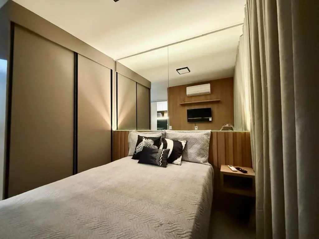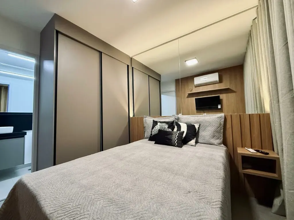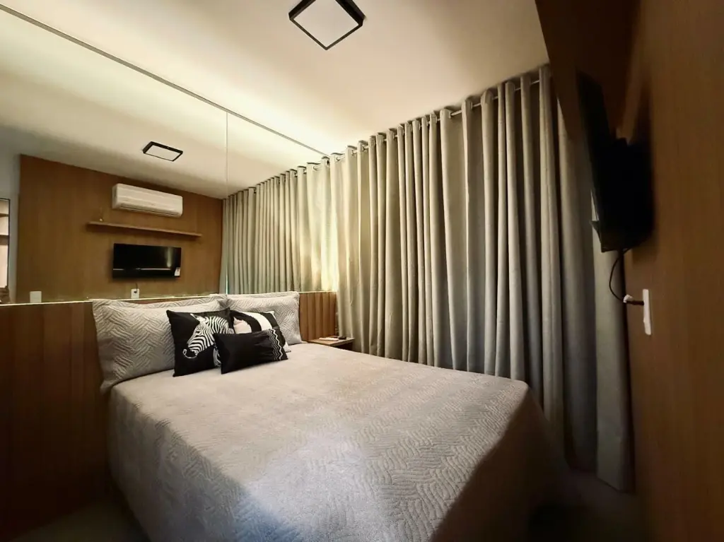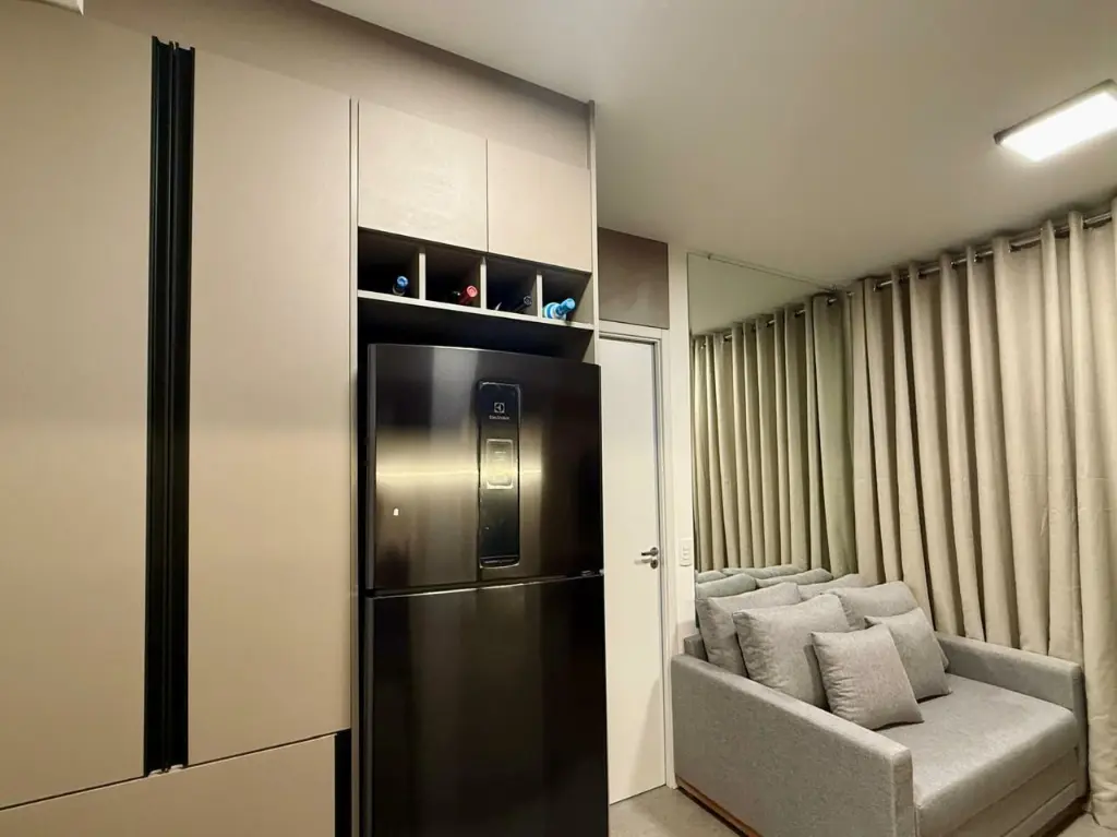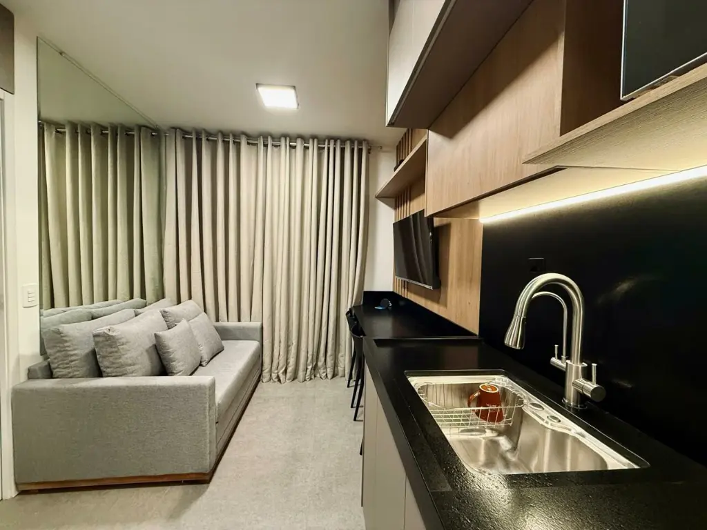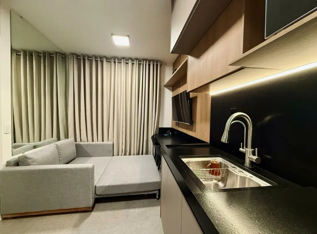 Apartamento equipado com eletrodomésticos, móveis planejados em todos os ambientes, sala com sofá cama, área de estudo. Ideal para quem busca praticidade, conforto e funcionalidade em um espaço moderno e bem aproveitado.