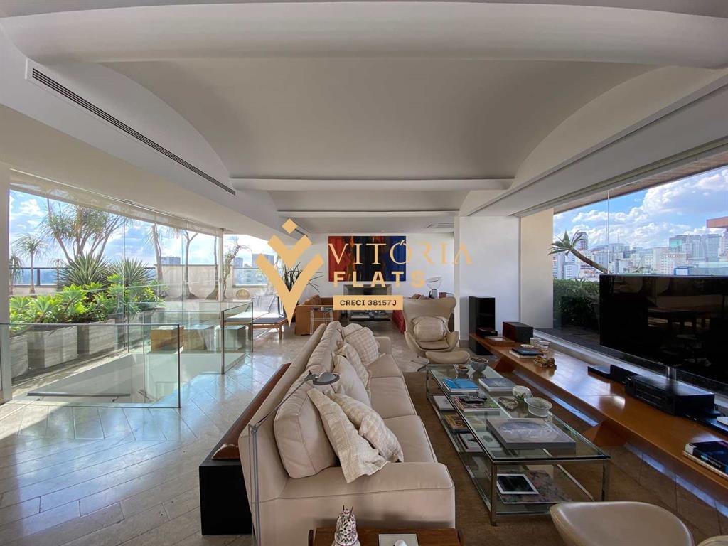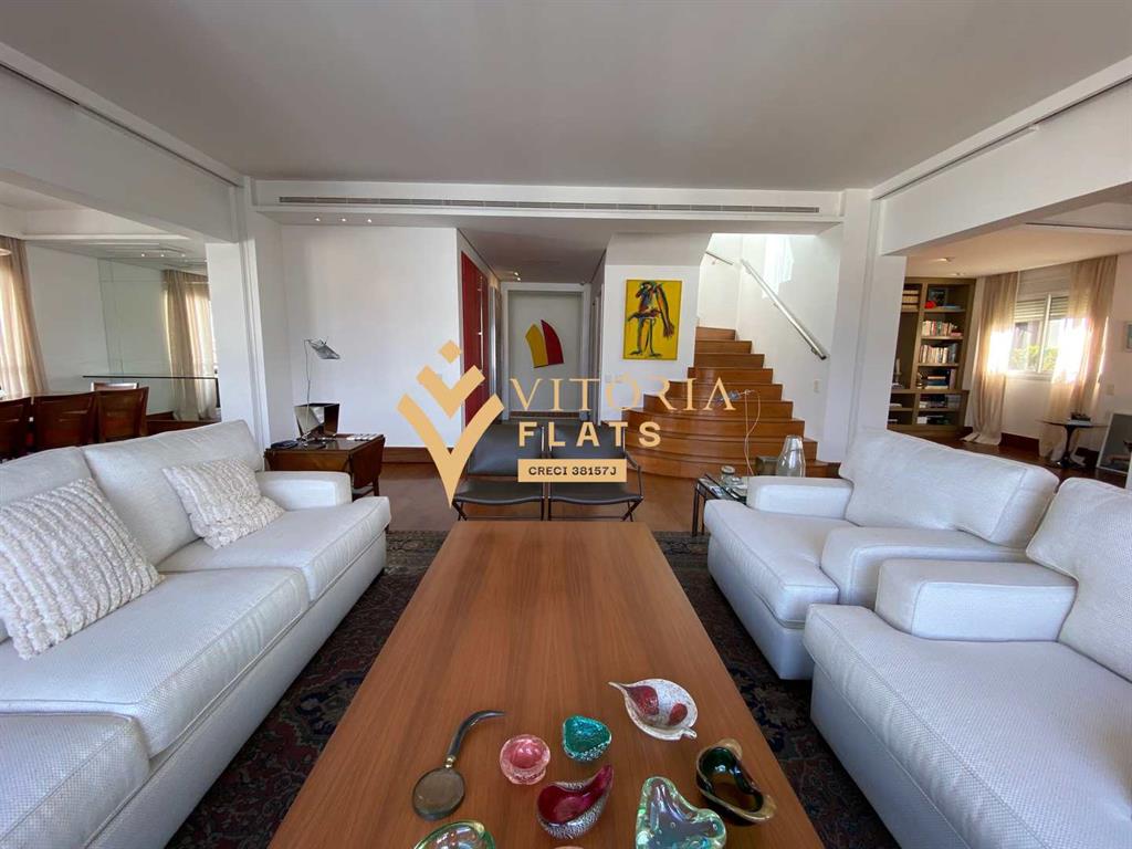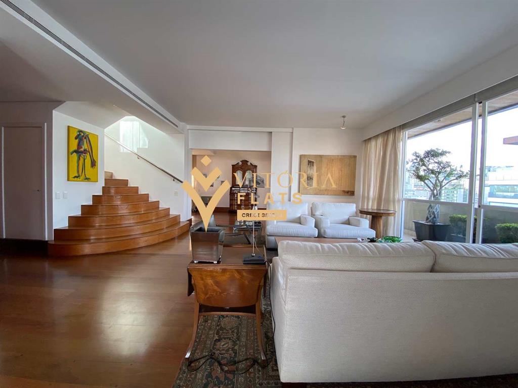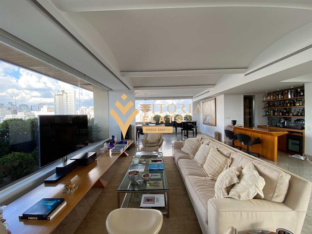 Linda cobertura duplex, com 515 m² muito bem divididos, no primeiro piso fica um amplo living com sala de estar, jantar, biblioteca / home office, varanda, lavabo, chapelaria, hall individual com porta blindada, 3 ótimas suítes, sendo a master com closet Sr. e Sra, hidro e varanda, copa, cozinha espaçosa com despensa, área de serviço, 2 dependências de serviço e 1 banheiro de serviço, no segundo piso fica um living com sala de TV, sala de estar com lareira, sala de piano, bar, adega com porta blindada, banheiro, sauna, academia (podendo ser revertida em dormitório), amplo terraço com piscina e vista livre para o Jardins.