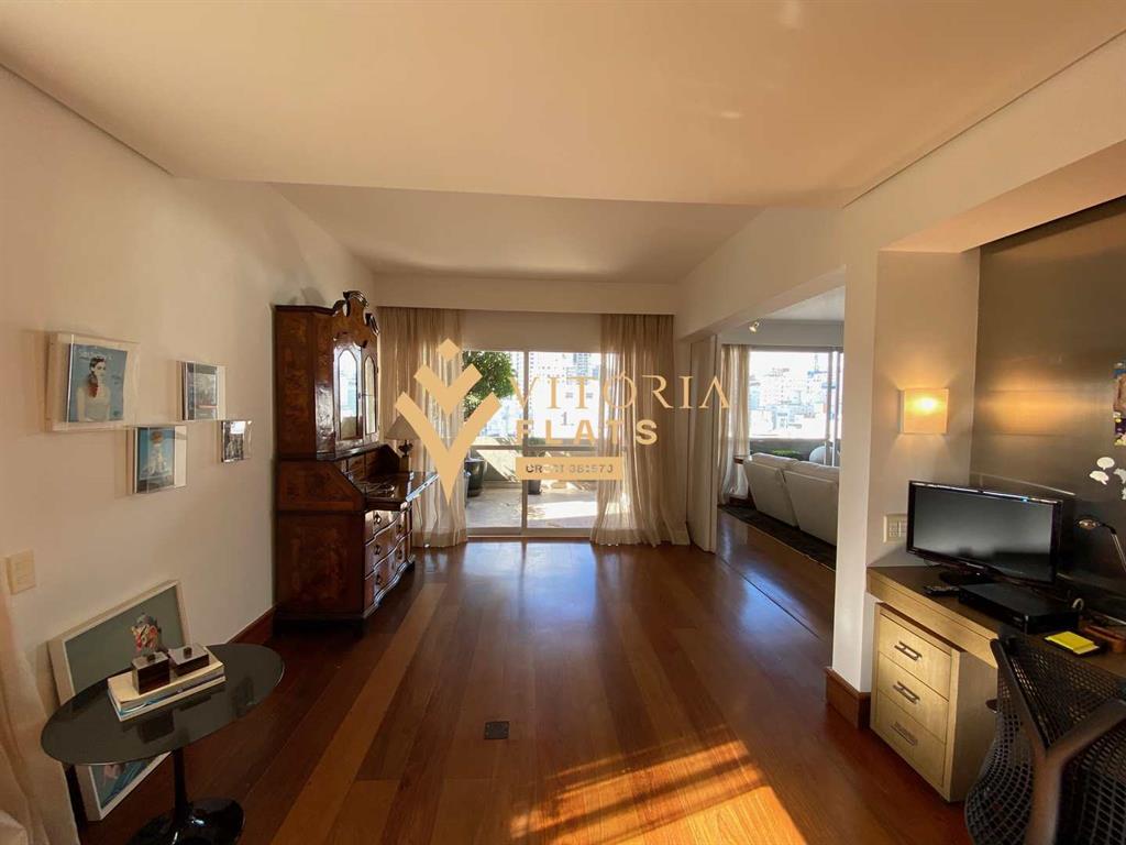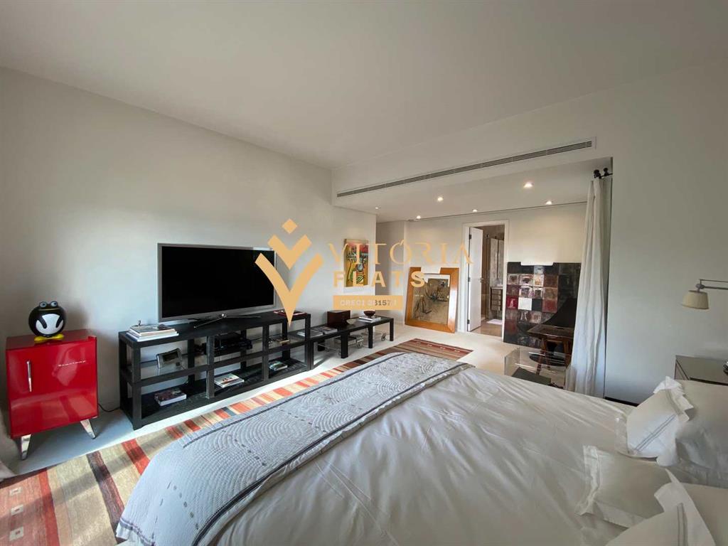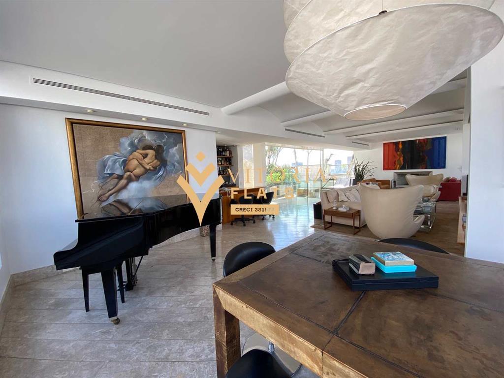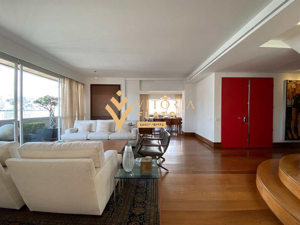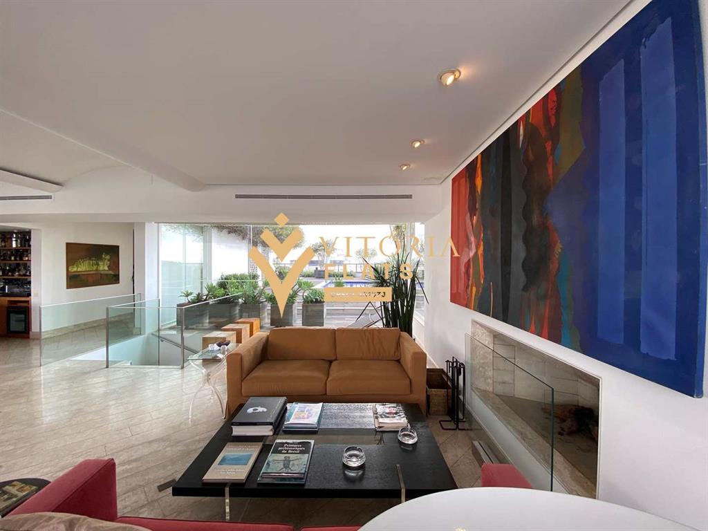 Linda cobertura duplex, com 515 m² muito bem divididos, no primeiro piso fica um amplo living com sala de estar, jantar, biblioteca / home office, varanda, lavabo, chapelaria, hall individual com porta blindada, 3 ótimas suítes, sendo a master com closet Sr. e Sra, hidro e varanda, copa, cozinha espaçosa com despensa, área de serviço, 2 dependências de serviço e 1 banheiro de serviço, no segundo piso fica um living com sala de TV, sala de estar com lareira, sala de piano, bar, adega com porta blindada, banheiro, sauna, academia (podendo ser revertida em dormitório), amplo terraço com piscina e vista livre para o Jardins.
