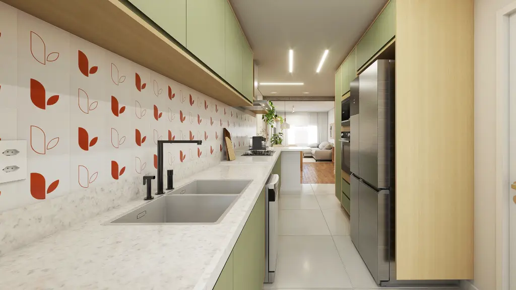 Nossa arquiteta Tamires Souza atualizou essa planta com a criação de uma suíte, e com a integração da cozinha à sala. De quebra, deixou pilares e vigas em concreto aparente, e adicionou uma charmosa divisória de cobogó para separar a cozinha da área de serviço.