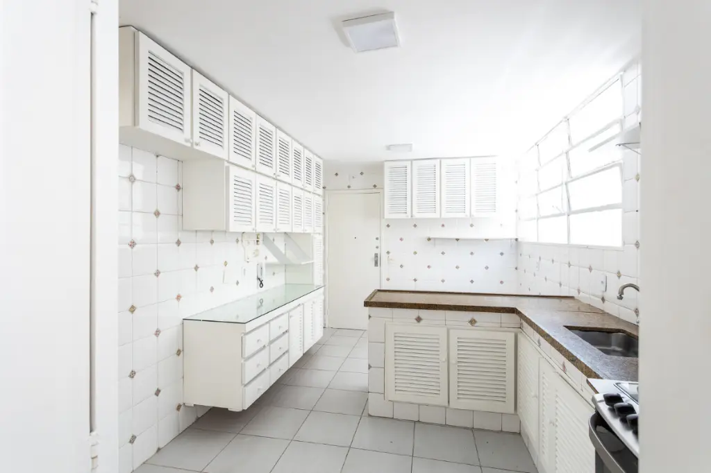 A copa-cozinha é funcional e bem equipada, com marcenaria de ótima qualidade aliás, os armários planejados são um destaque em todo o apartamento.