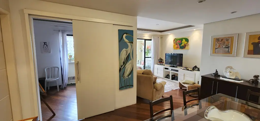 Com 116 m² muito bem distribuídos, o living para dois ambientes se abre para a varanda e ganha ainda mais charme com o piso de madeira maciça, que traz elegância e calor ao ambiente. É um espaço com proporção, luz e conforto, ideal tanto para o cotidiano quanto para receber com naturalidade.