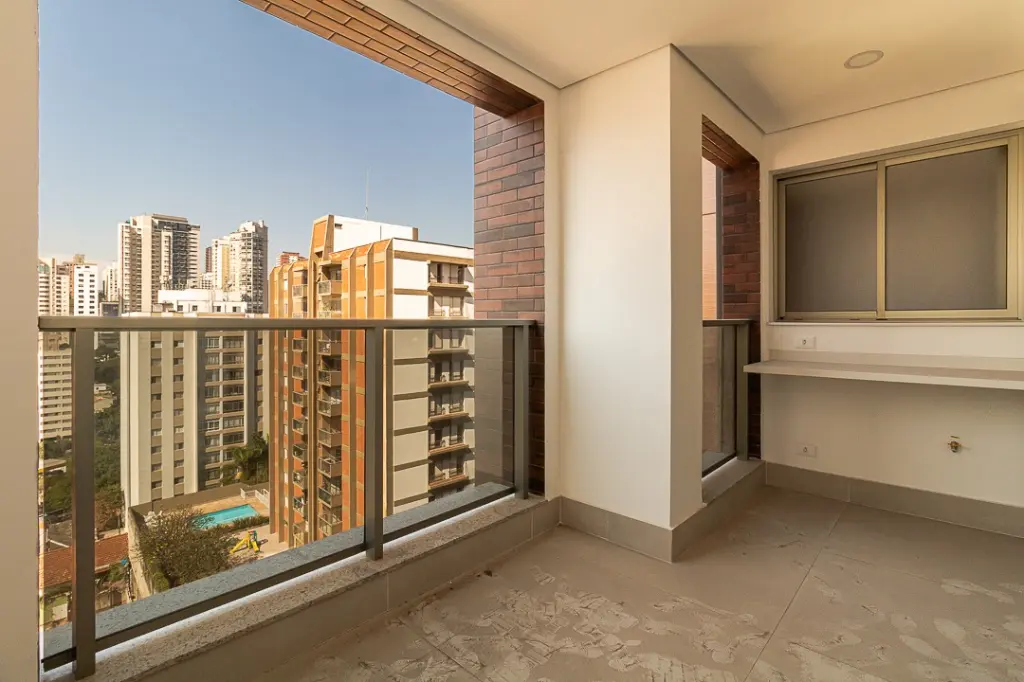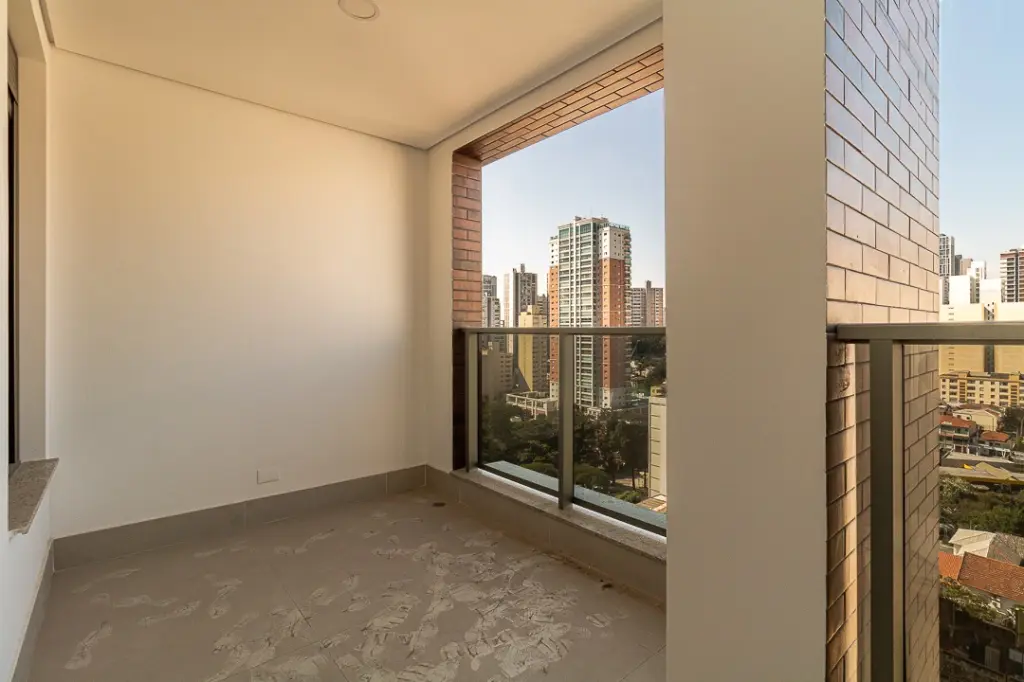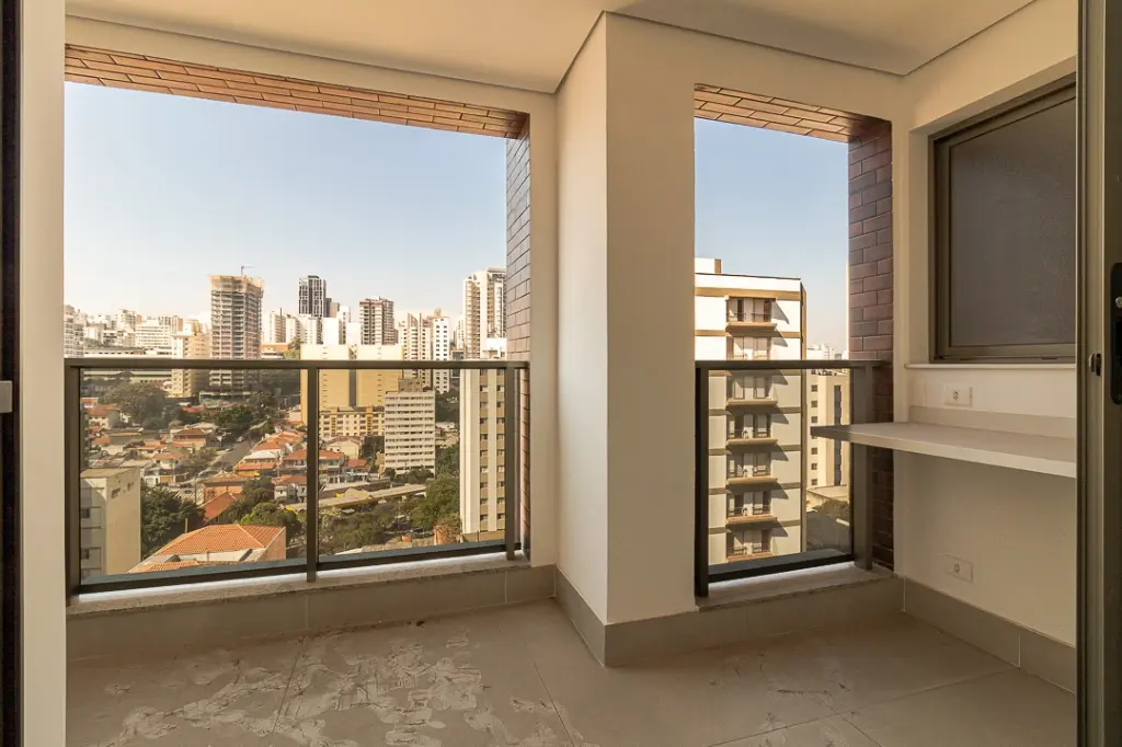 Varanda com guarda corpo em alumínio com vidro refletivo suave, que