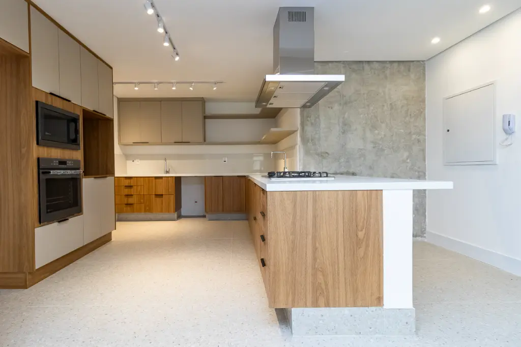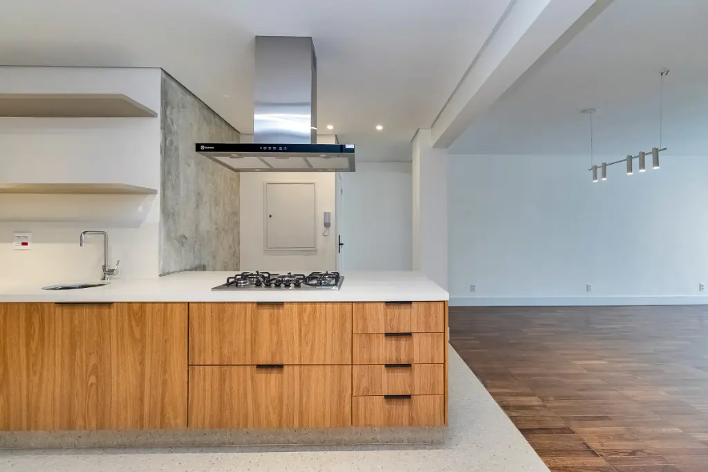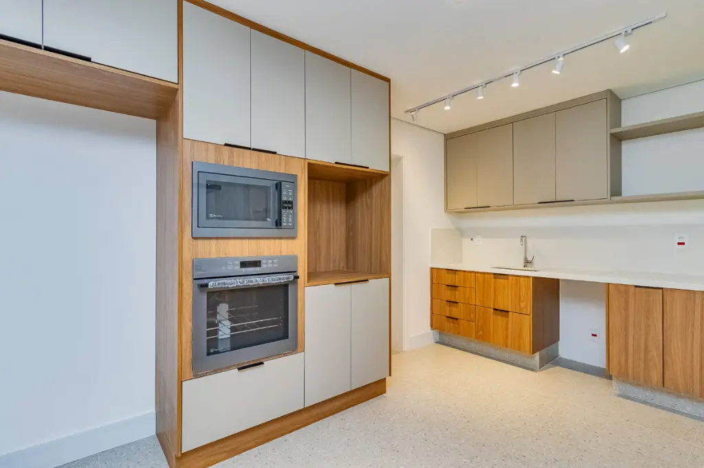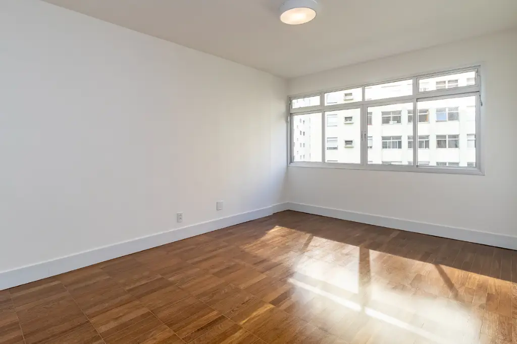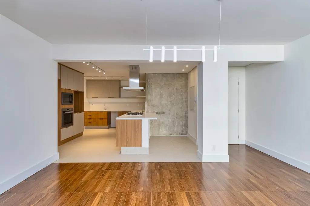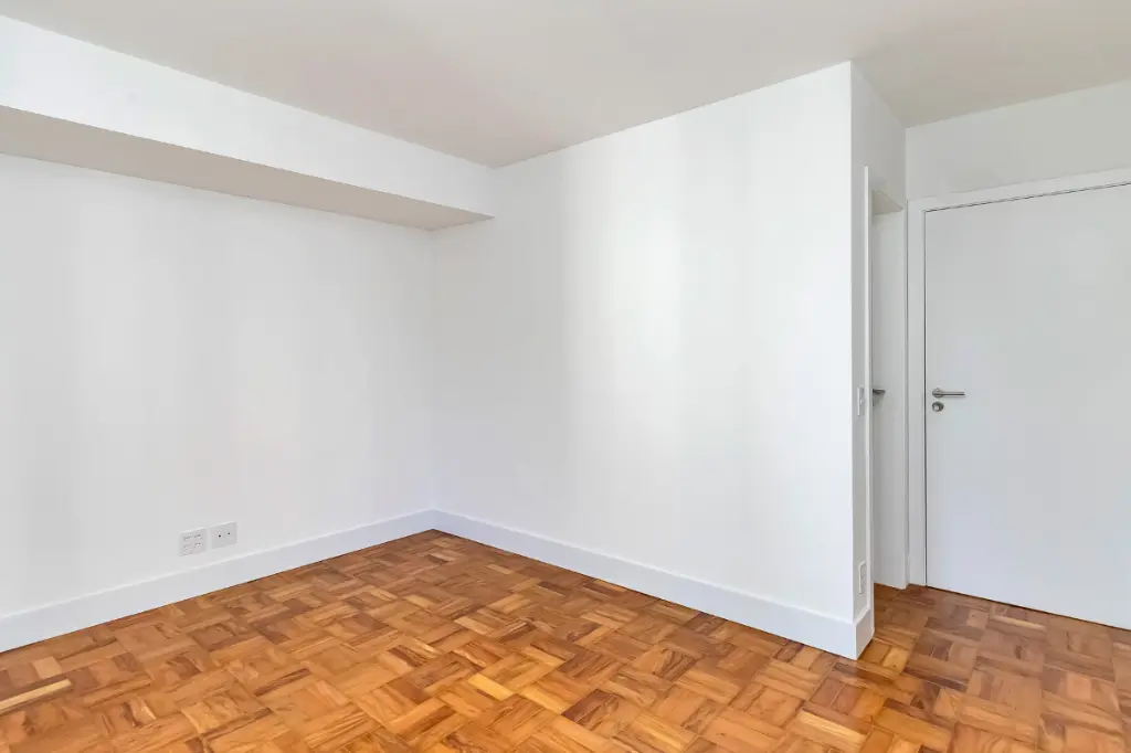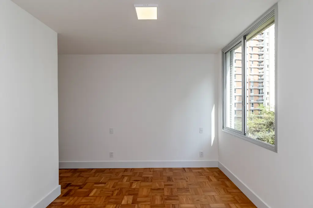 O piso da sala, no tradicional tacão de madeira Sucupira, foi finamente restaurado. O projeto é complementado por acabamentos de alto padrão, marcenaria sob medida na cozinha, área de serviço e banheiros, além de eletrodomésticos instalados (cooktop, coifa, forno elétrico) e aquecedor a gás.