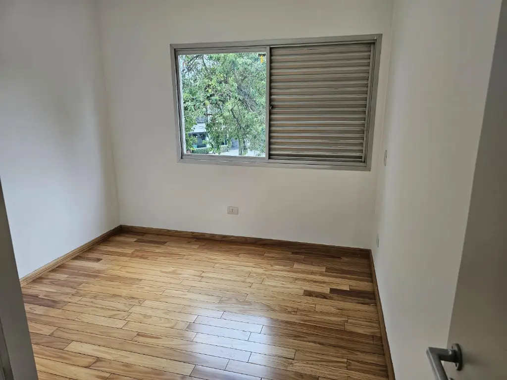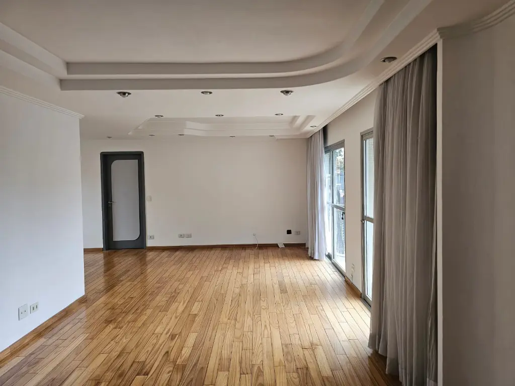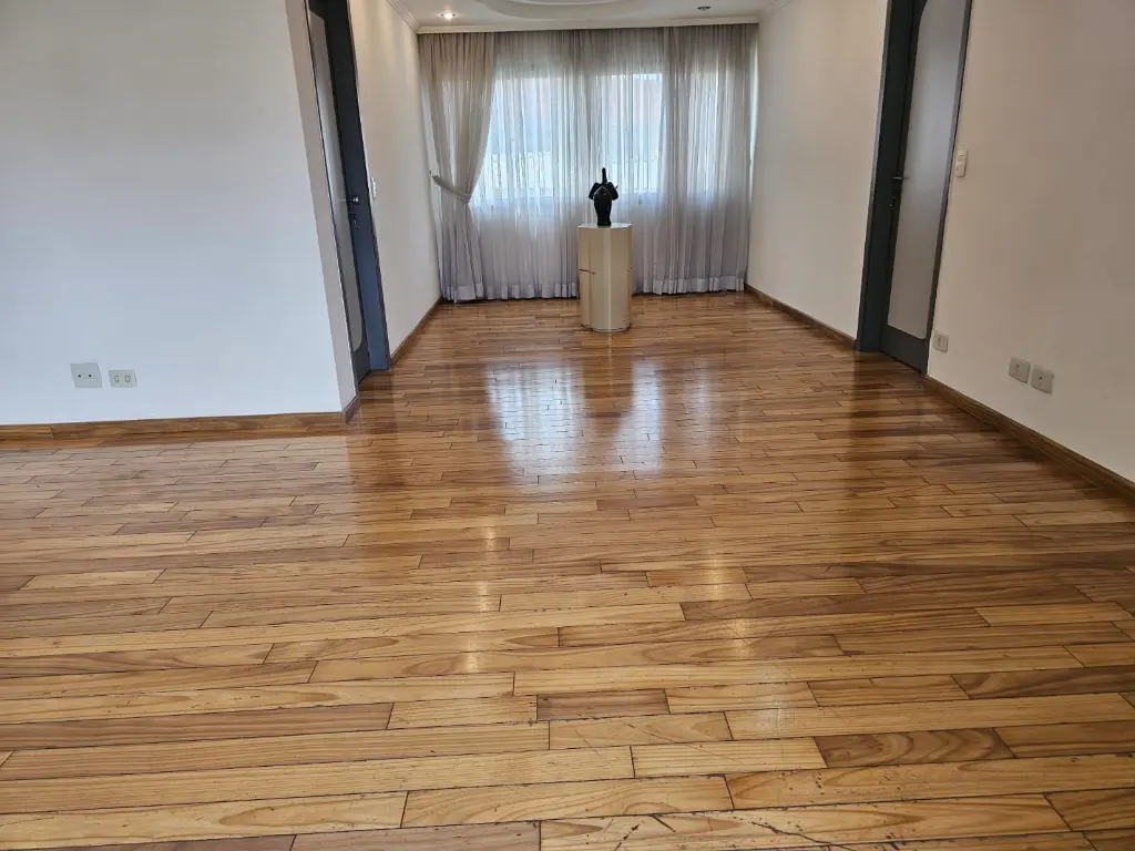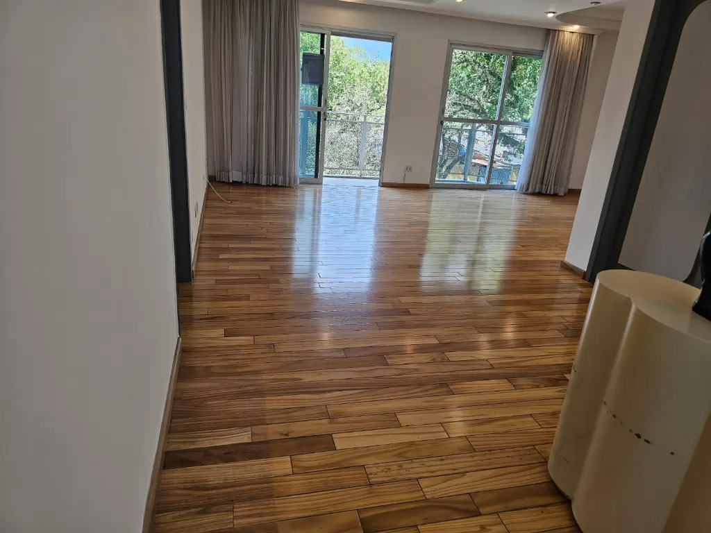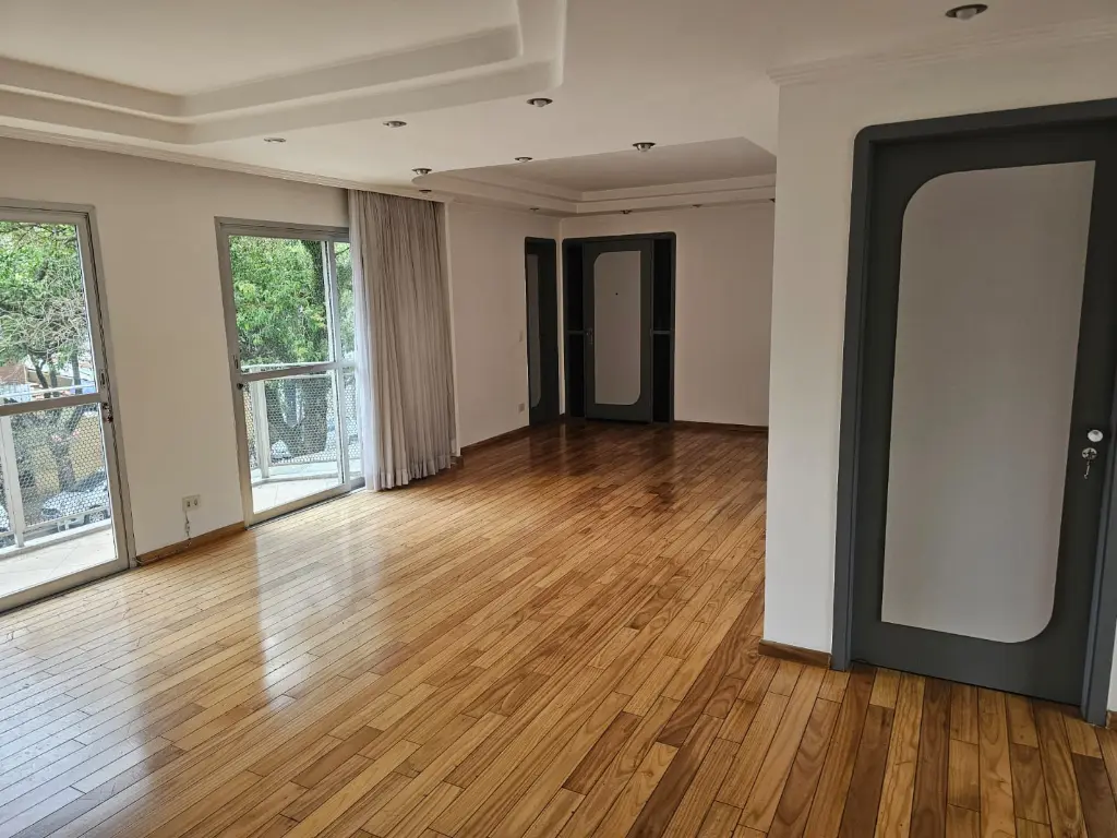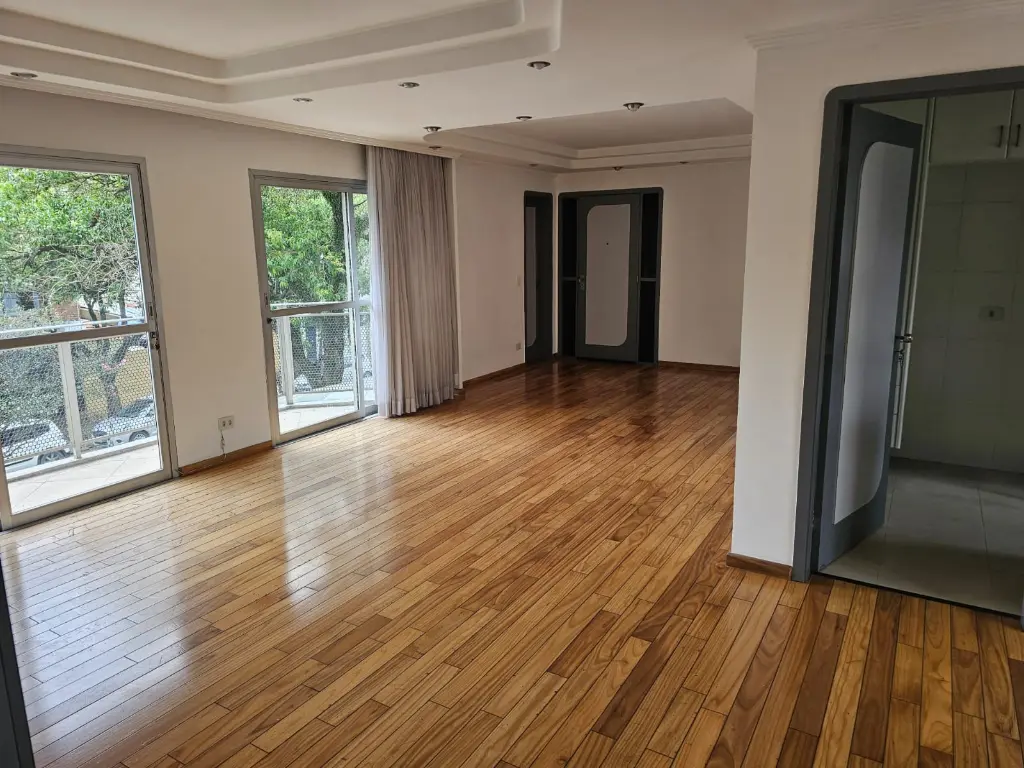 Apartamento em andar baixo, com 123m2 de área privativa, sala 2 ambientes com varanda que recebe o sol da manhã, lavabo, 3 dormitórios, sendo 1 suíte, banheiro social, cozinha com armários planejados e janelões permitindo muita luz natural, área de serviço com banheiro. Piso de madeira em todos os ambientes.