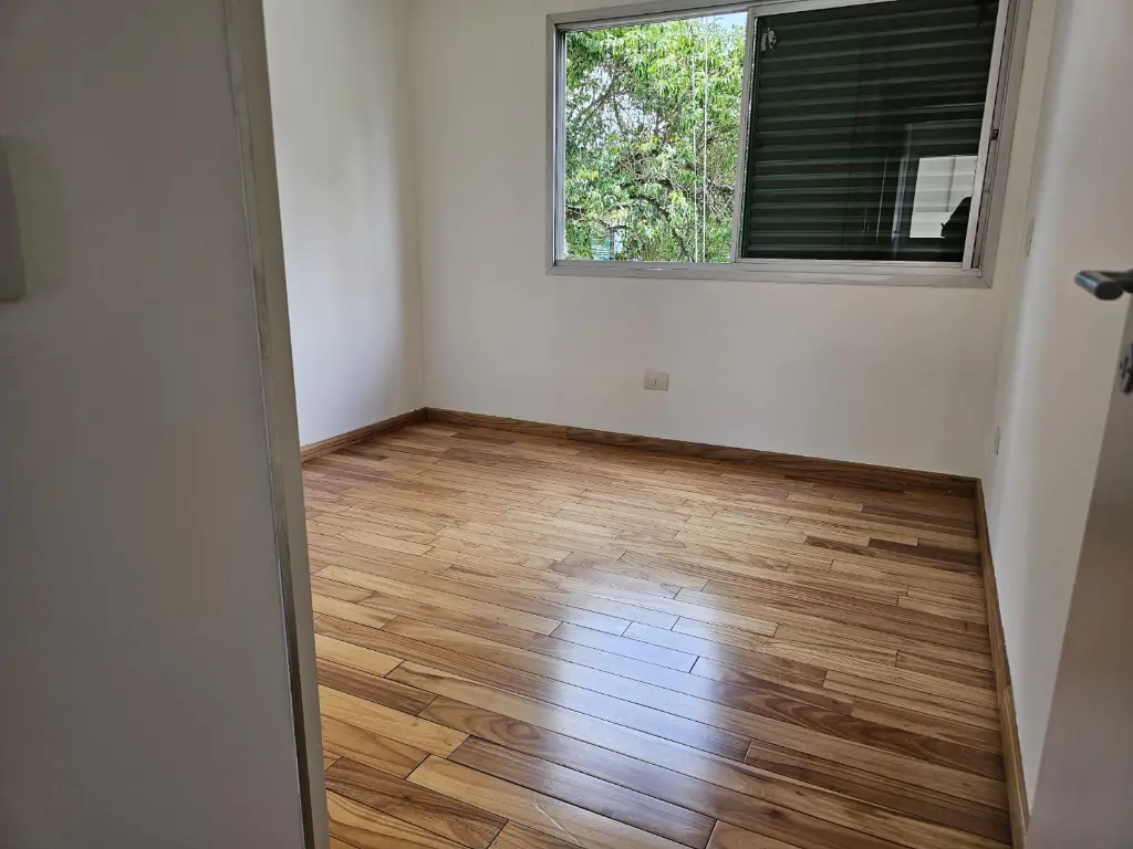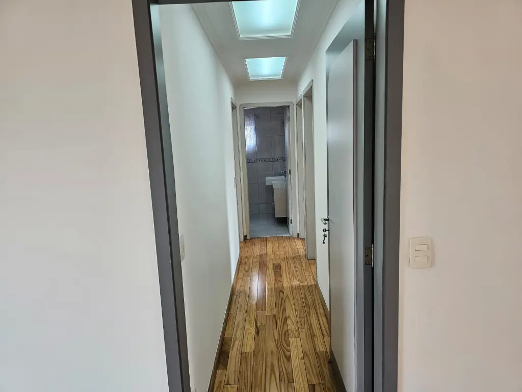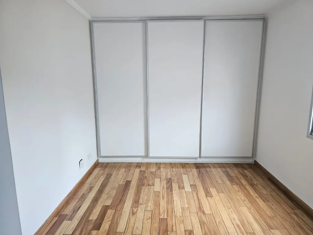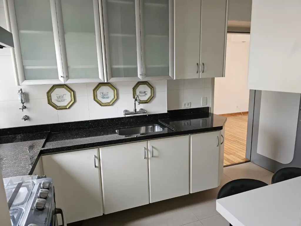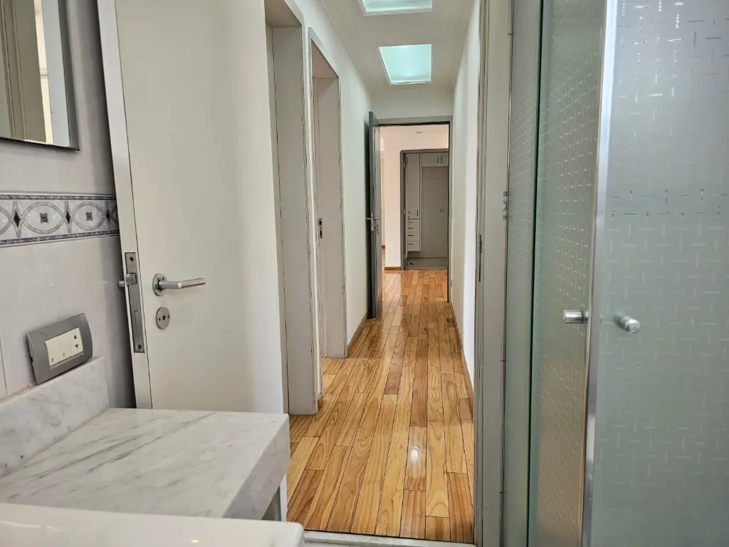 Apartamento em andar baixo, com 123m2 de área privativa, sala 2 ambientes com varanda que recebe o sol da manhã, lavabo, 3 dormitórios, sendo 1 suíte, banheiro social, cozinha com armários planejados e janelões permitindo muita luz natural, área de serviço com banheiro. Piso de madeira em todos os ambientes.