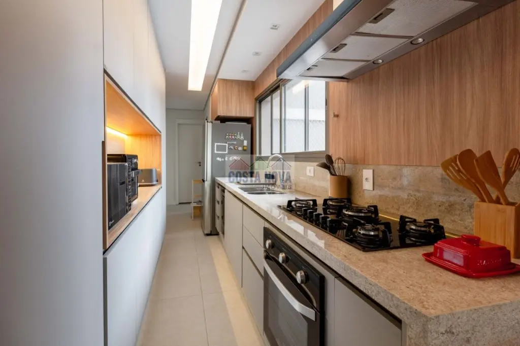 Hall privativo, living com dois ambientes com marcenaria especial e acolhedora com folhado de madeira, lavabo, varanda gourmet com churrasqueira à carvão, cozinha semi integrada e muito bem planejada. Dormitório de serviço montado como home-office.