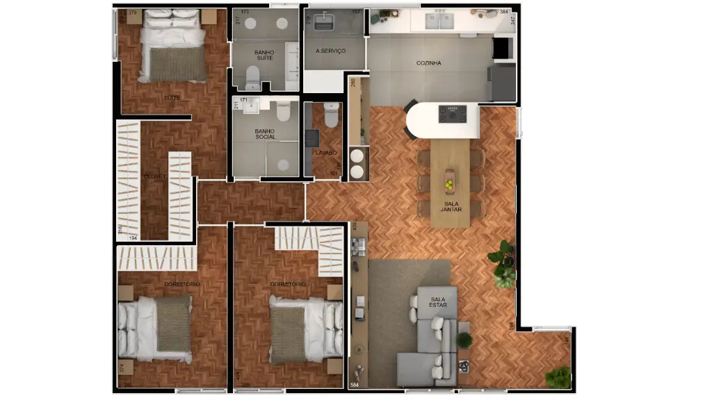 115 m² área útil / 1 vaga de garagem / 3 dormitórios, sendo 1 suíte