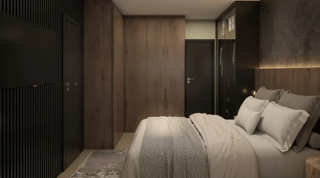 - Suíte master com cabeceira em madeira com LED, mesas de cabeceira, armários planejados, cortinas e banheiro completo.