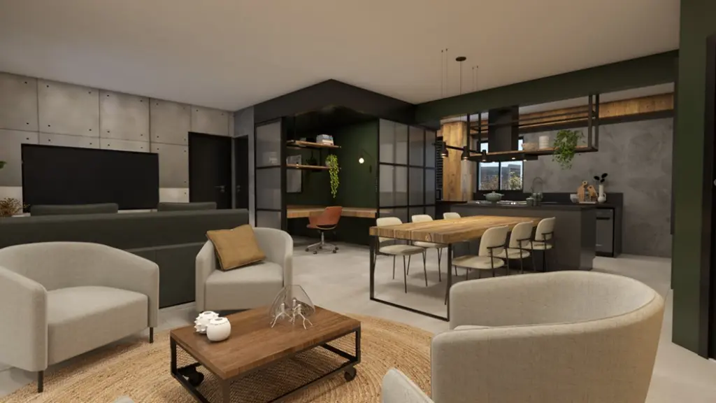 - Living ampliado com sala de estar, TV e jantar (mesa para 6 lugares), espaço para bar/café e lavabo.