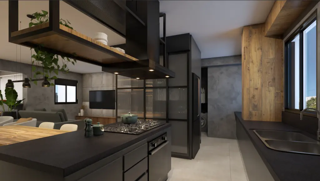 - Cozinha americana com ilha, cooktop, forno, depurador e armários planejados.