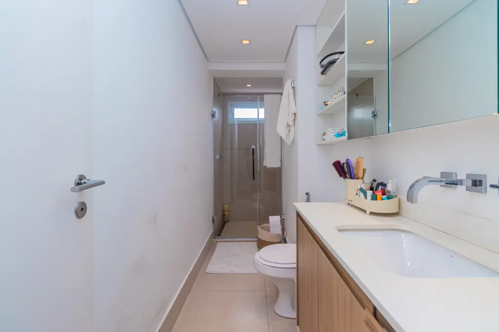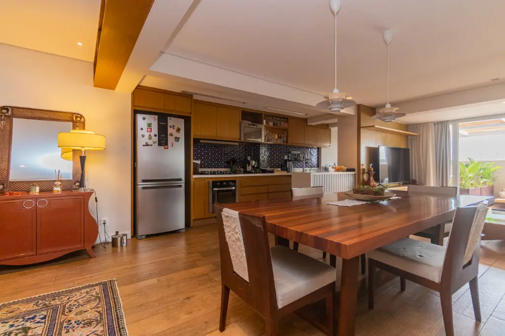 São 150 m² extremamente bem resolvidos. O living é amplo e iluminado, integrado de maneira fluida à área externa privativa, criando um ambiente sofisticado, acolhedor e perfeito para receber. A cozinha também se integra ao espaço social por meio de um lindo balcão que conecta os ambientes com elegância e aconchego, favorecendo momentos de convivência e funcionalidade no dia a dia.