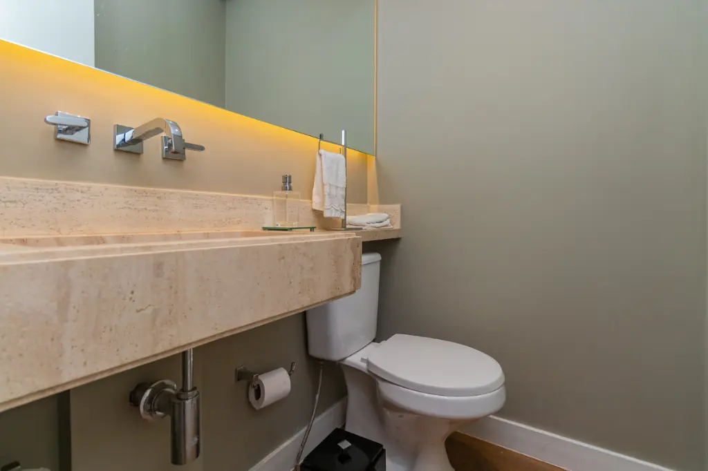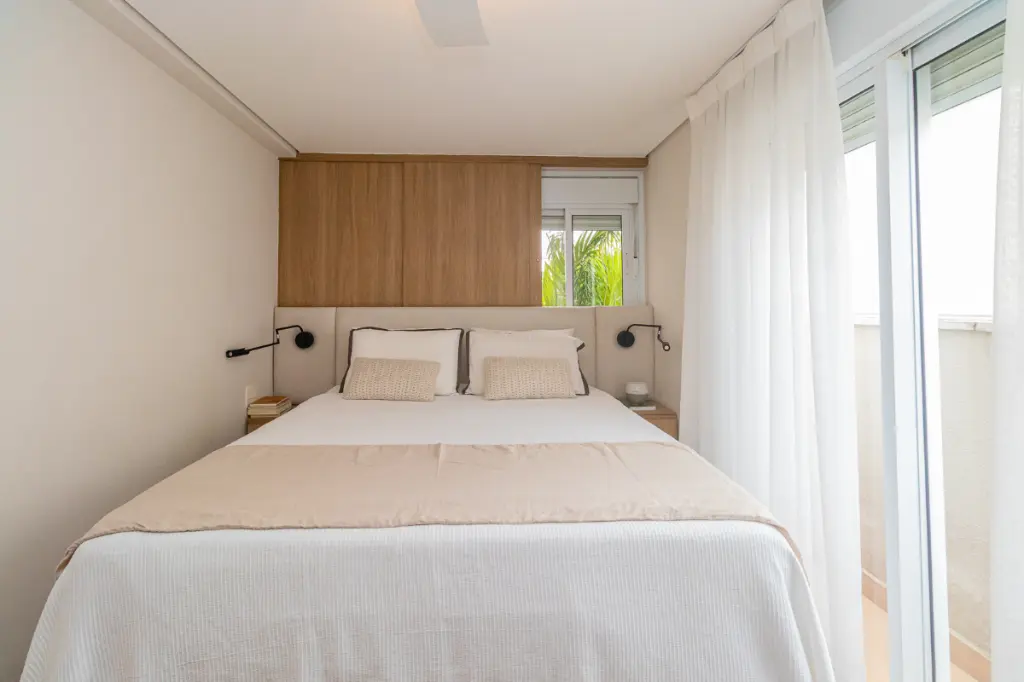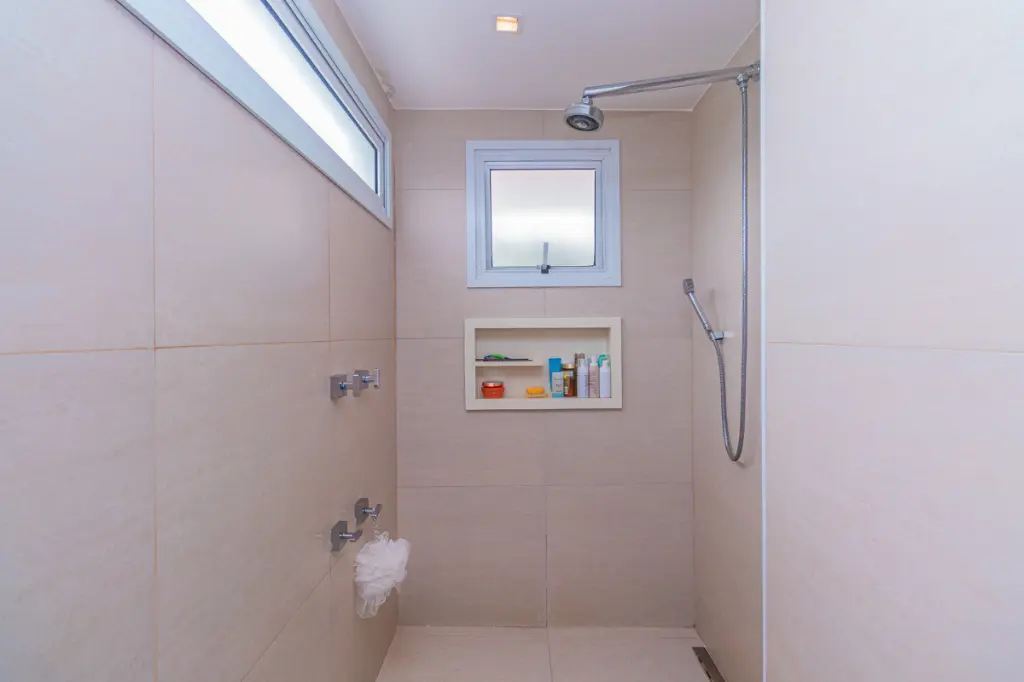 A área íntima dispõe de duas suítes confortáveis e bem distribuídas. A suíte master se destaca pelo banheiro amplo, com dois chuveiros, oferecendo uma experiência de conforto superior.