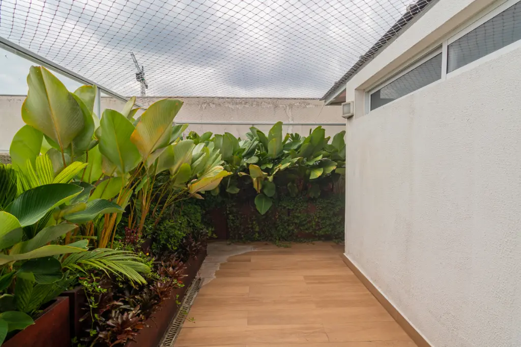 A área externa complementa o charme do apartamento garden, com paisagismo e sistema de irrigação automática para as plantas, garantindo praticidade na manutenção e preservando a beleza do espaço verde.