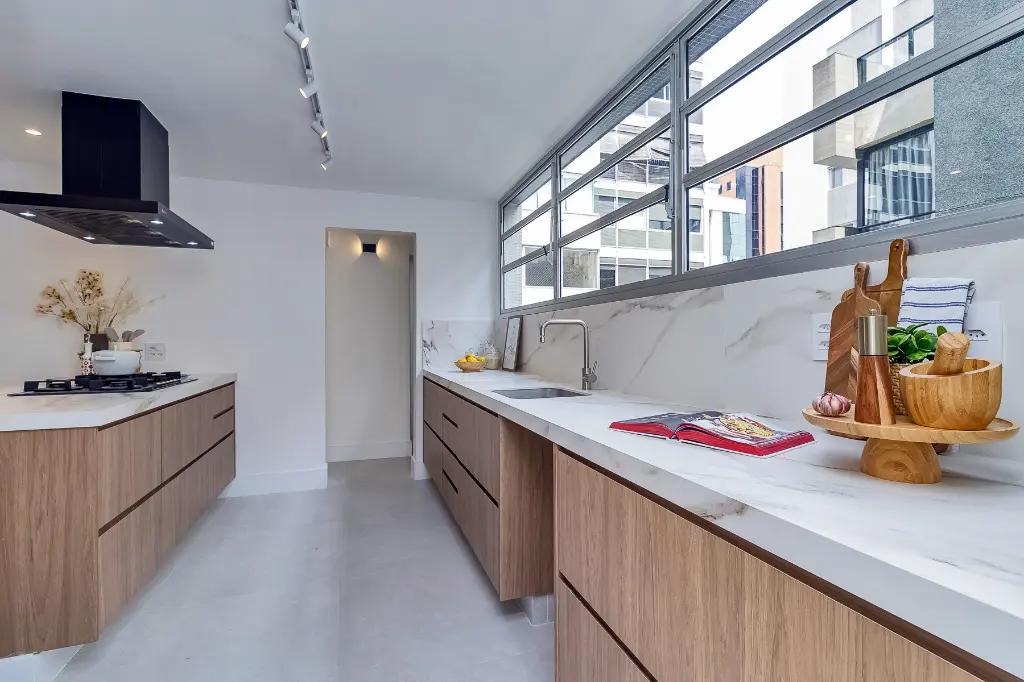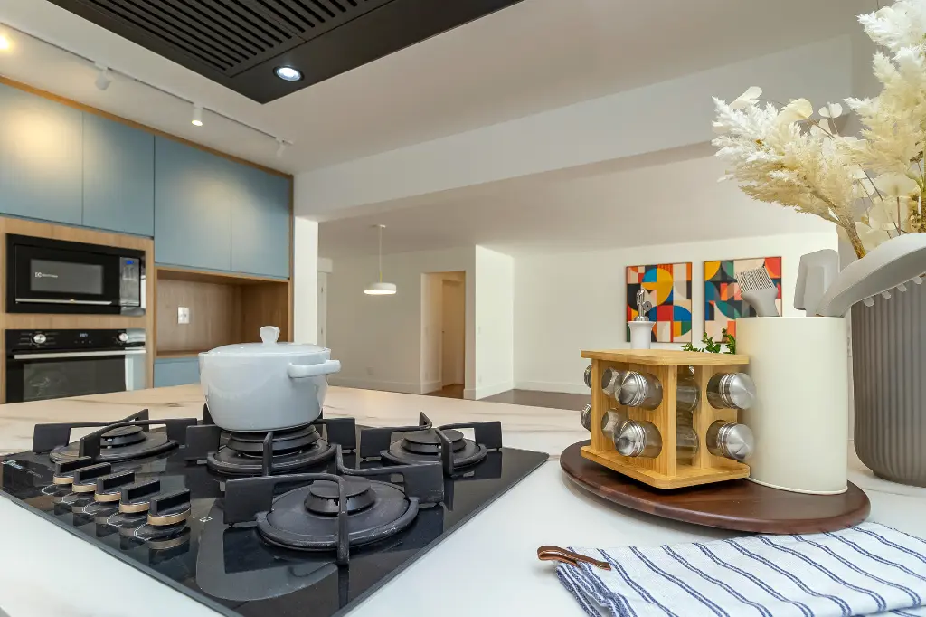 Apto sendo entregue com marcenaria (cozinha, área de serviço, gabinetes dos banheiros), cooktop, coifa, forno elétrico e aquecedor à gás.