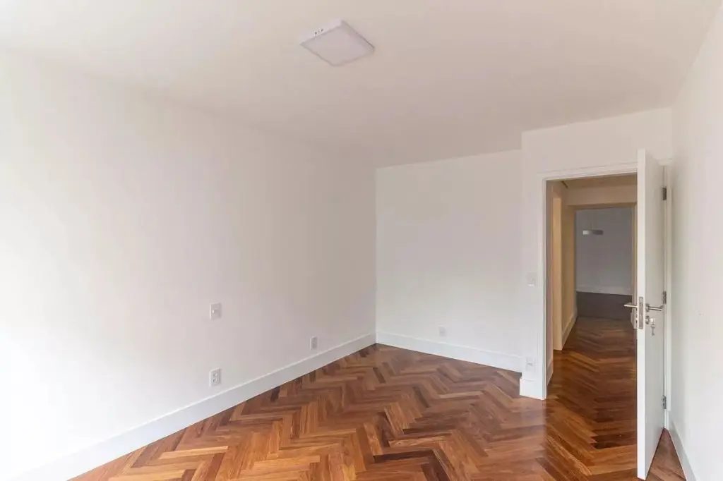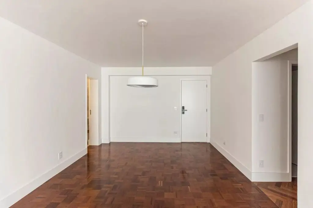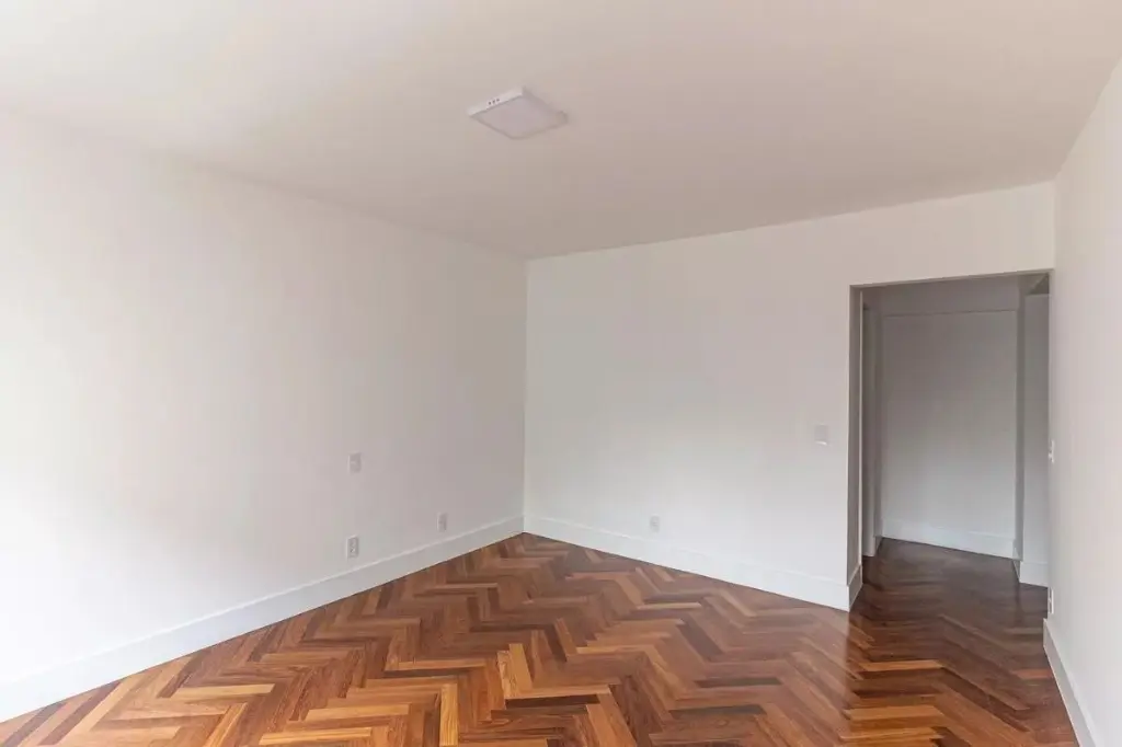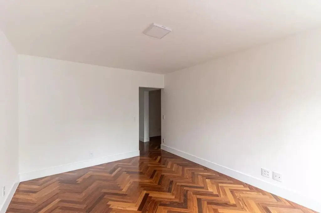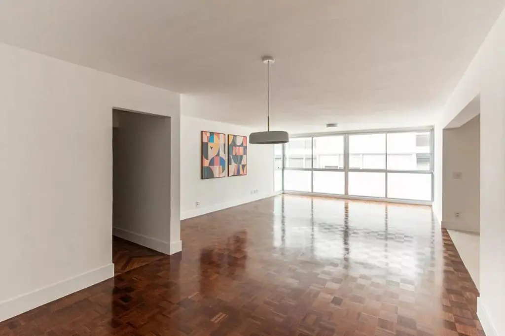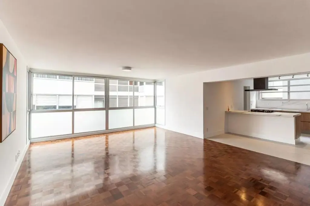 Na área íntima, o projeto permitiu criar um banheiro para cada dormitório: duas suítes e um terceiro quarto atendido por um banheiro social. No living, a ampla sala com janelão piso-teto oferece uma vista privilegiada para o belíssimo Edifício Solar do Conde, um ícone da arquitetura modernista em Higienópolis. O piso original em taco mini parquet foi restaurado com todo cuidado, trazendo charme e acolhimento ao ambiente.