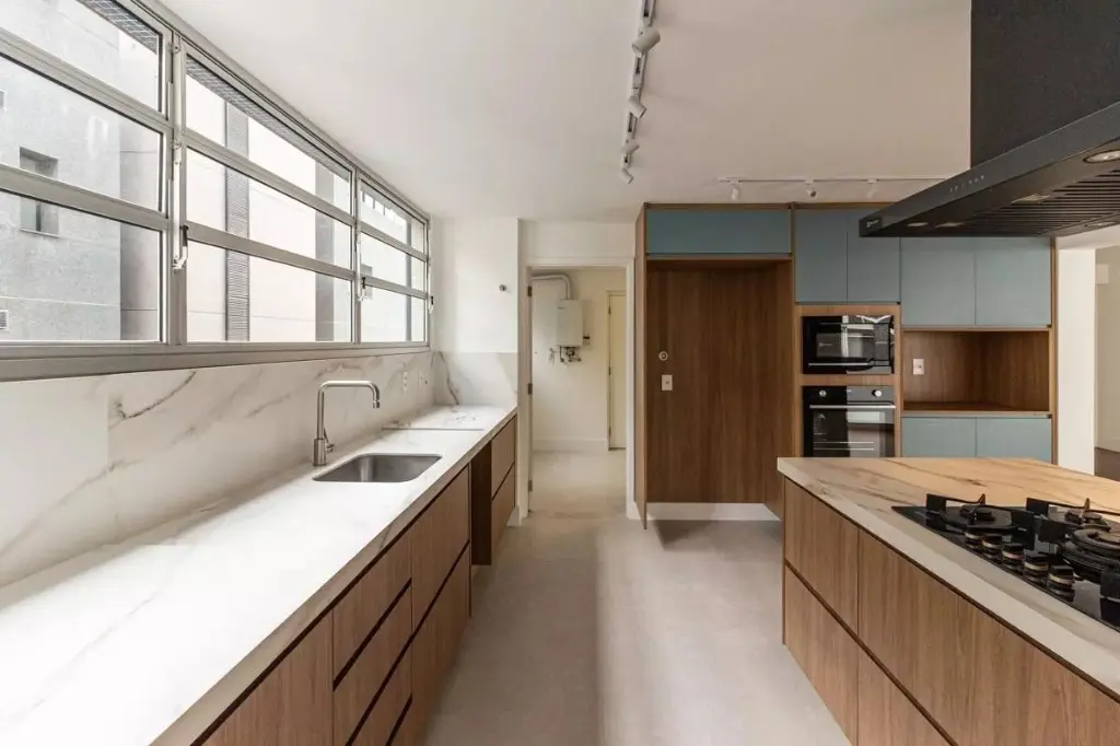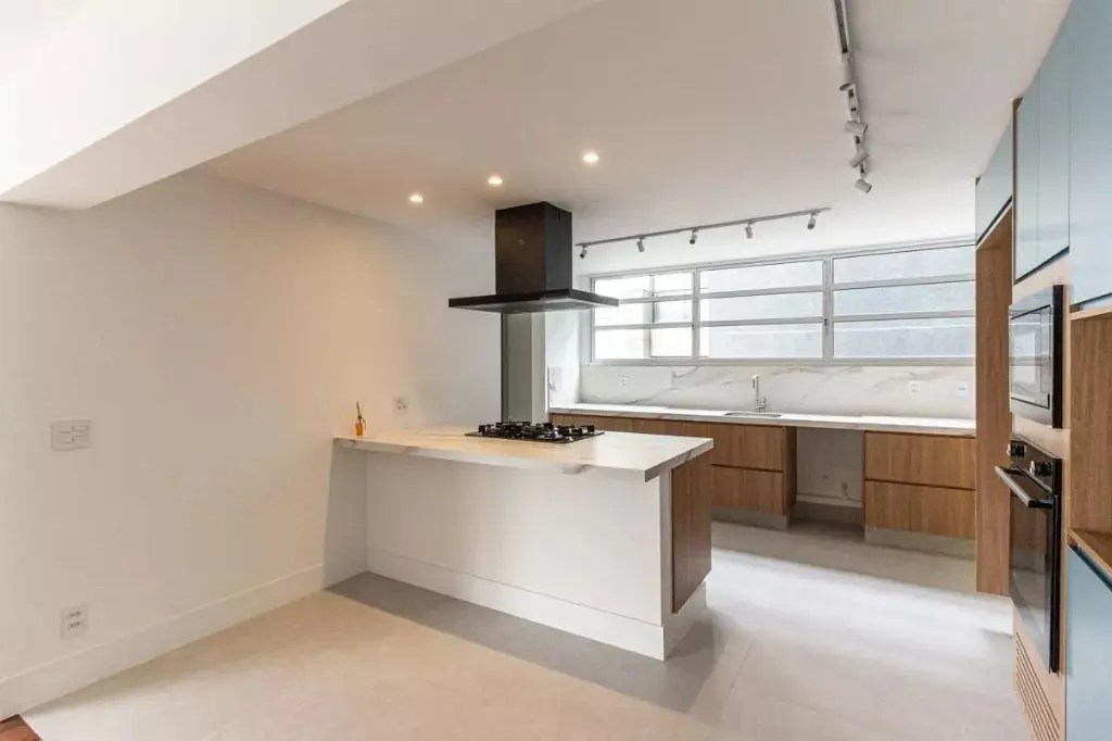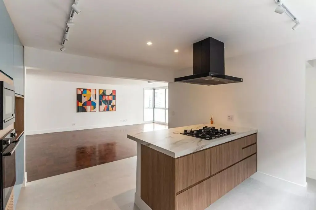 A cozinha integrada à sala reforça a sensação de amplitude e cria um espaço perfeito para receber amigos e para o convívio do dia a dia.