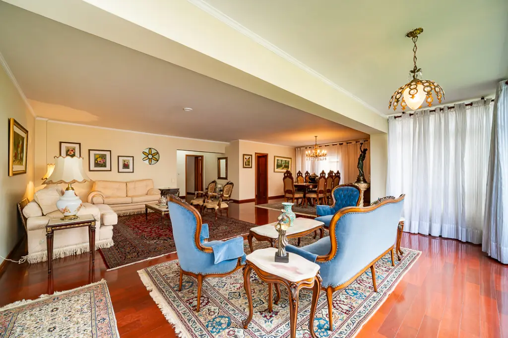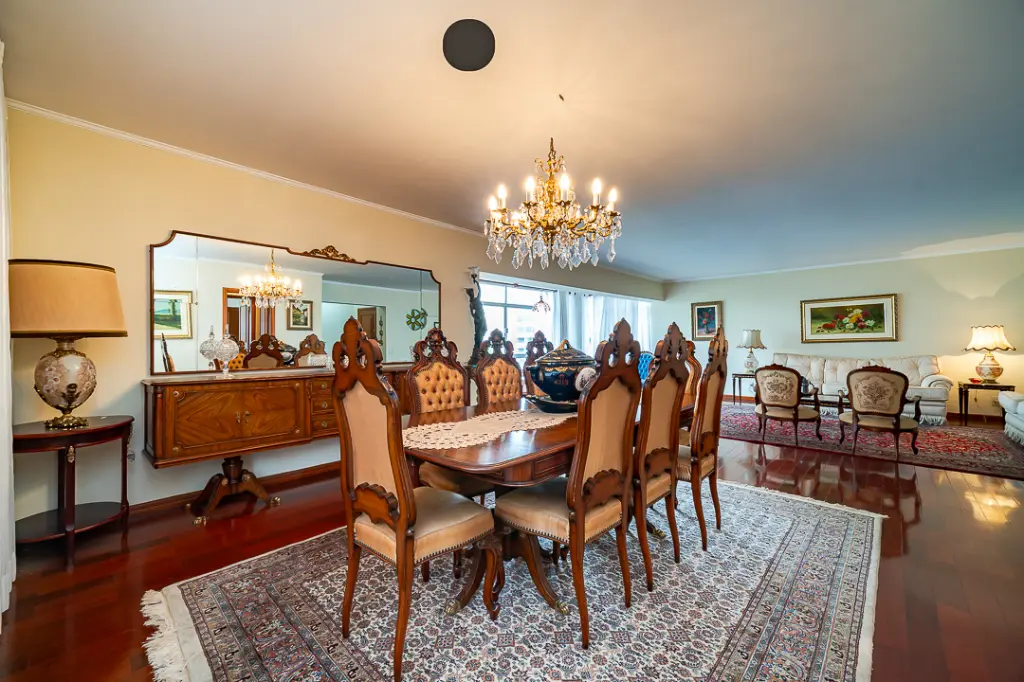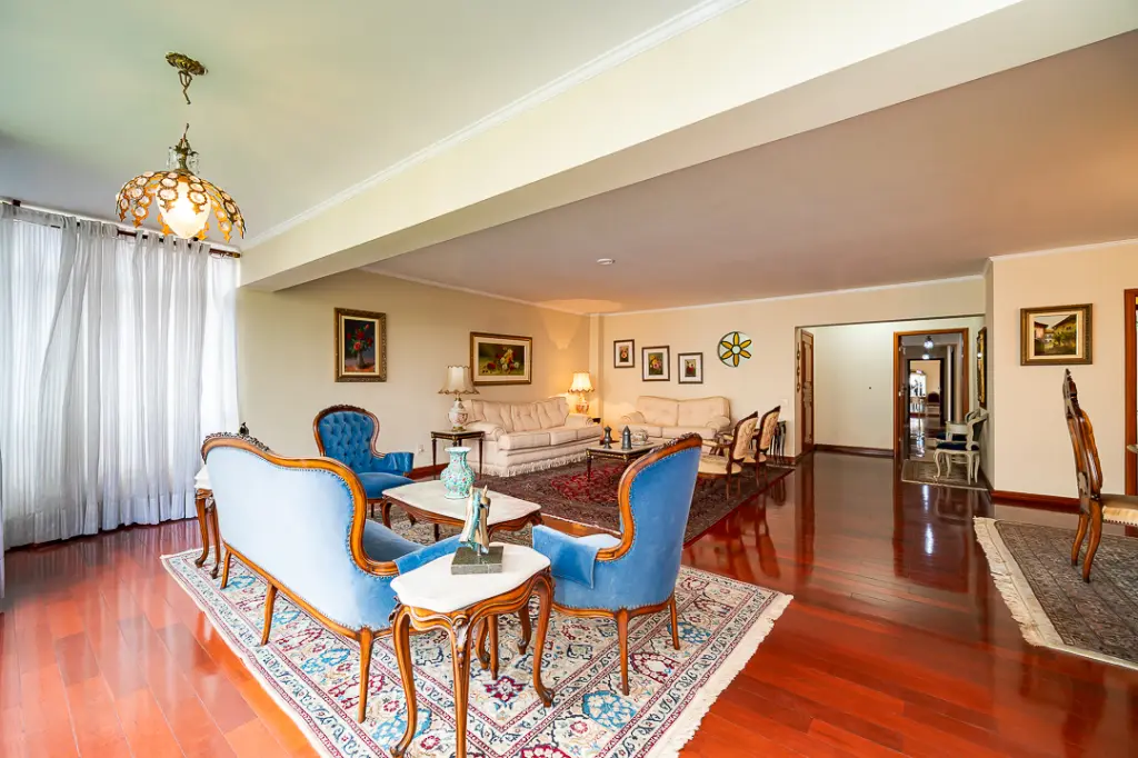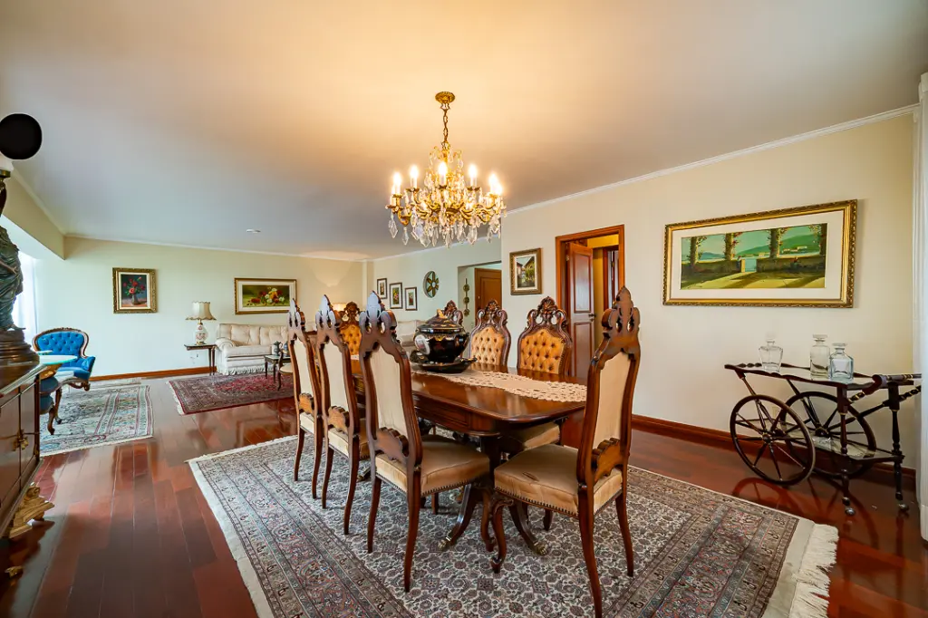 A área social impressiona com uma sala para três ambientes, perfeita para receber, relaxar e celebrar bons momentos. O piso de taco de madeira, impecável, traz um toque clássico e acolhedor a cada espaço.