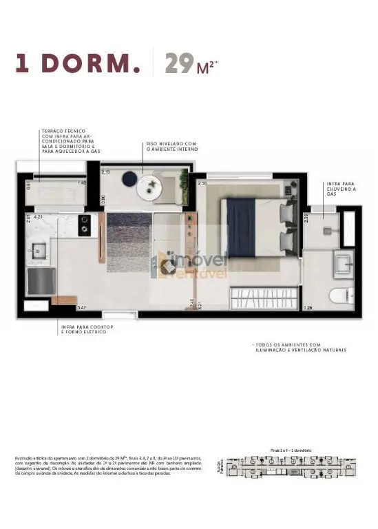 Planta de 1 Dormito´rio de 29m2 com ventilac¸a~o natural na cozinha e banheiro.