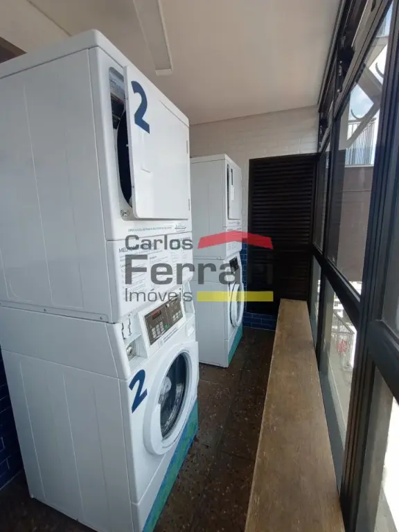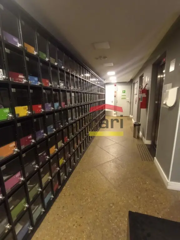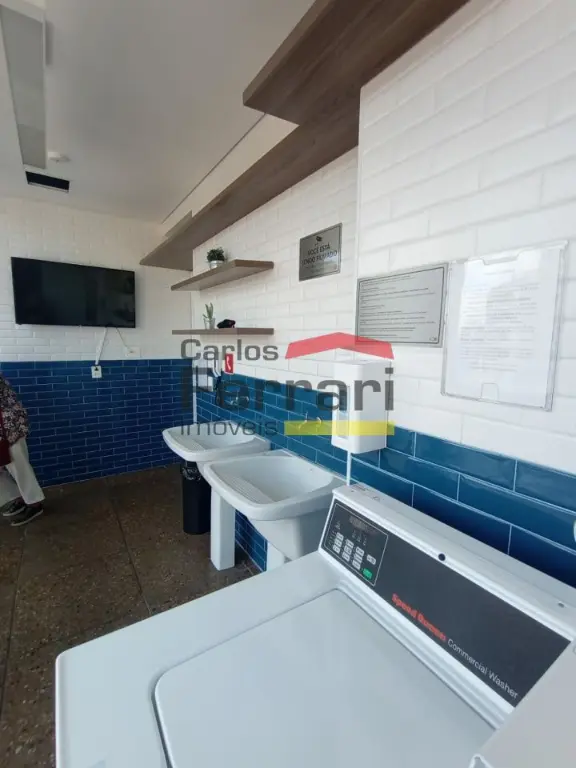 Condomínio com sala de ginástica, piscina com raia e lavanderia coletiva.