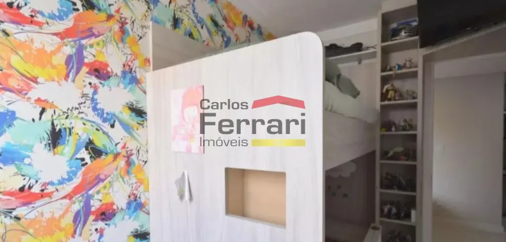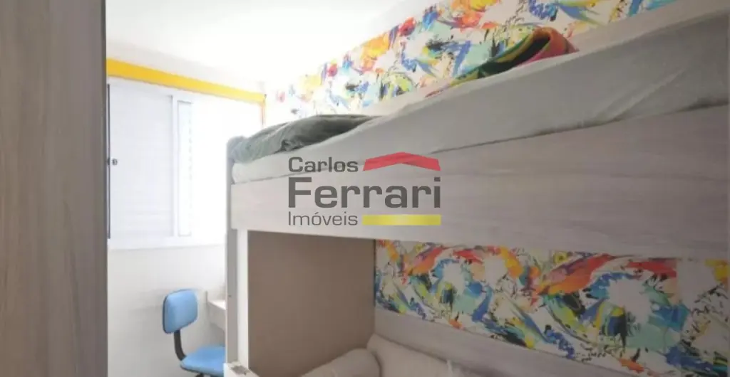 Imóvel semi mobiliado, com móveis planejados em todos os ambientes, fogão embutido, cama box e beliche, rack e painel na sala.