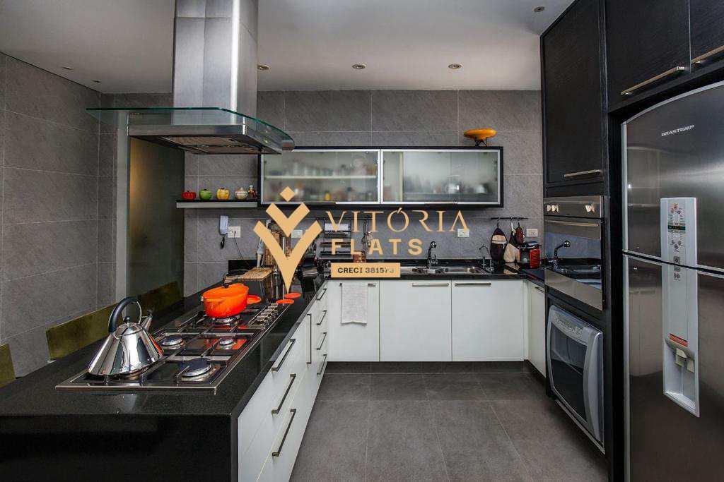 Com três dormitórios, dois banheiros sociais (um com jacuzzi e chuveiro duplo), banheiro de serviço, lavabo, área de serviço, adega, dispensa e uma cozinha completa com ilha, cooktop, forno, lava-louça embutido e cuba dupla com triturador. A bancada com filtro, e dispenser de detergente.