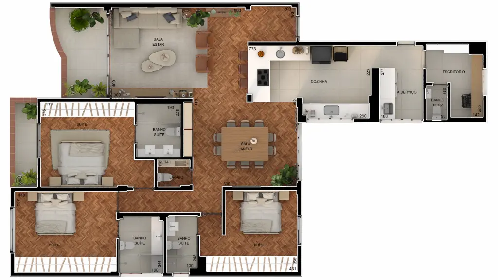 São 177 m2, muito bem distribuídos, com uma sala ampla para dois ambientes, integrada à cozinha, perfeita para receber, viver e ficar. A varanda se abre como um respiro, trazendo luz e aquela sensação boa de casa de verdade.