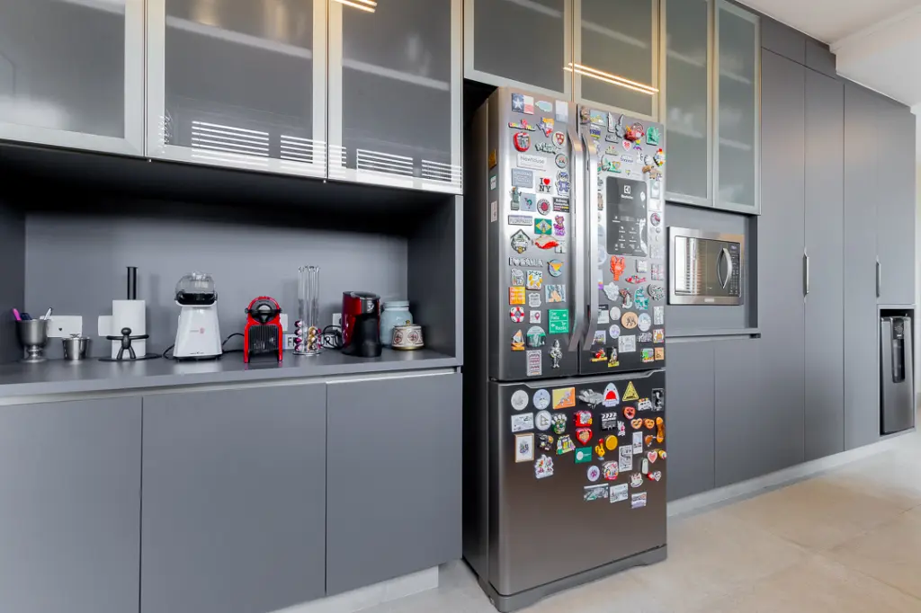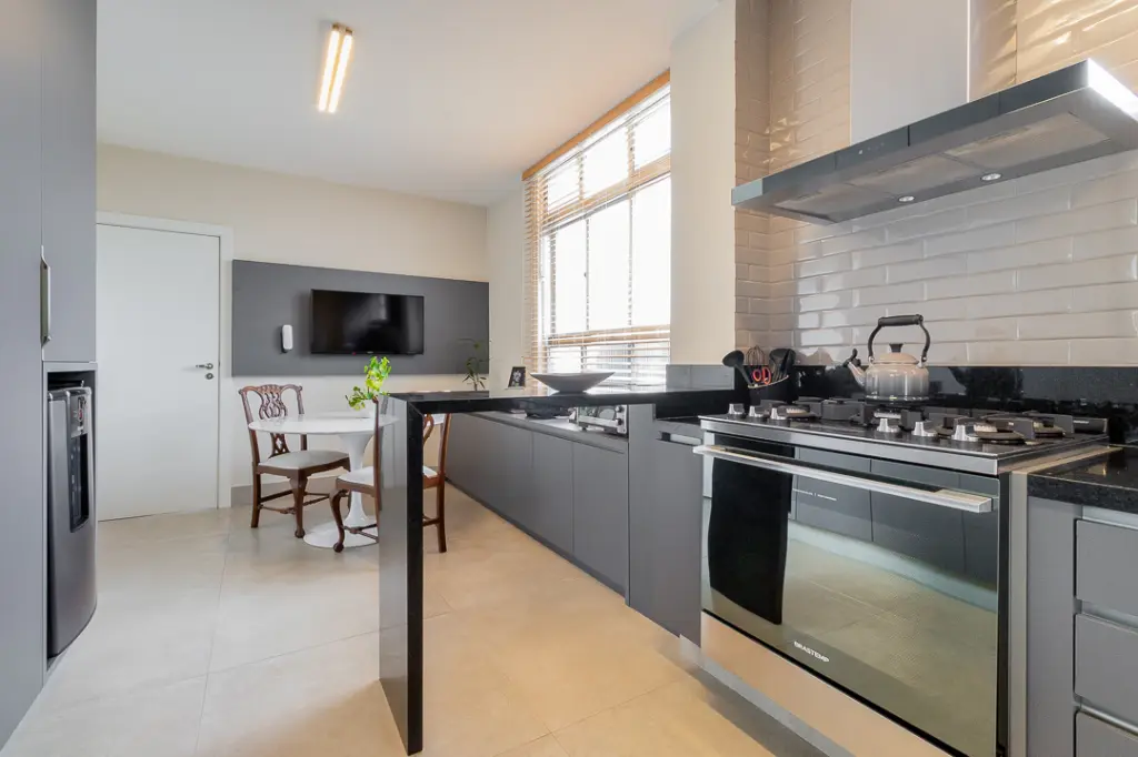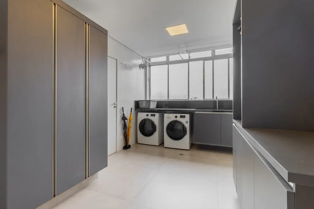 A copa-cozinha, totalmente equipada, apresenta desenho funcional e elegante, com armários sob medida, bancadas amplas e integração prática com a área de serviço. Dependência completa de empregada e área de serviço ventilada complementam a funcionalidade do imóvel, mantendo a organização da rotina diária.