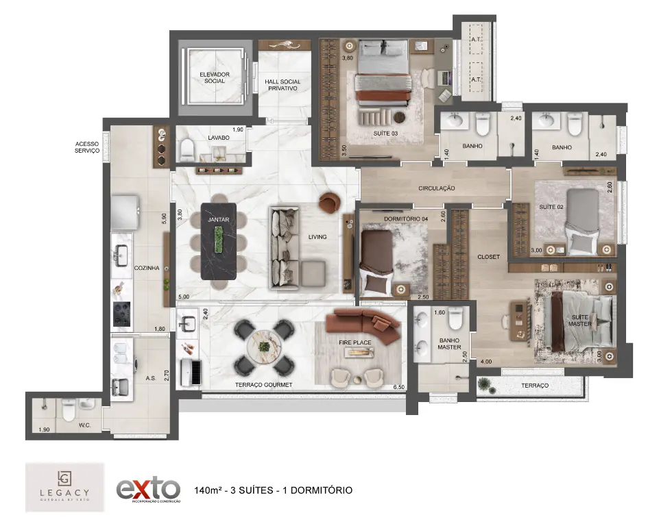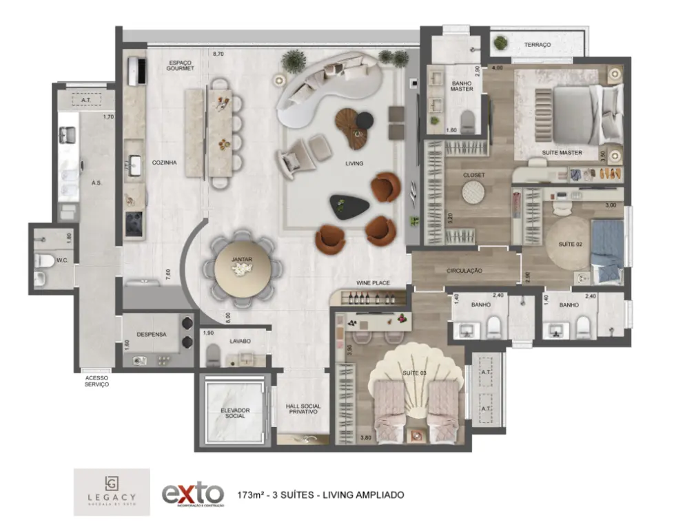 Com plantas espaçosas de 143 a 223m², o Legacy oferece residências com 3 e 4 dormitórios (sendo 3 ou 4 suítes), além de varandas amplas, ambientes integrados e acabamentos de alto nível.