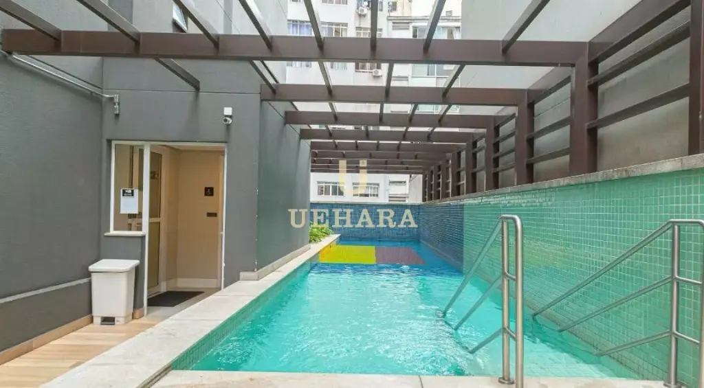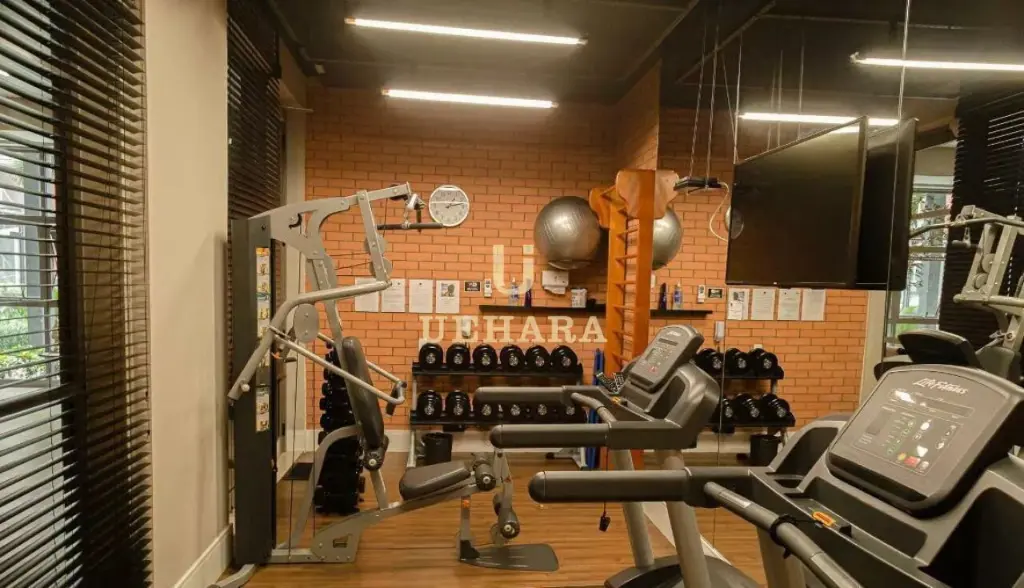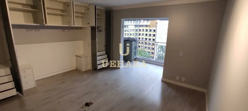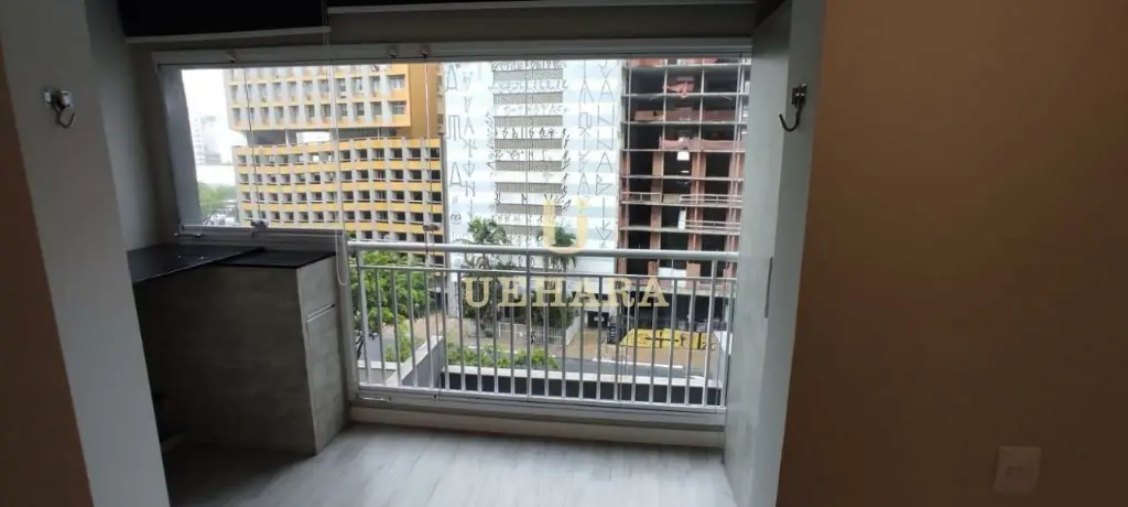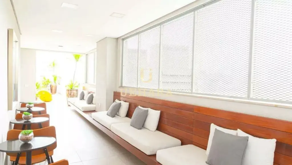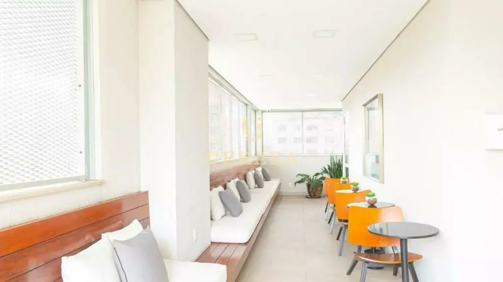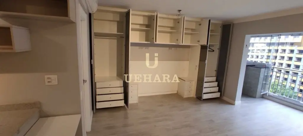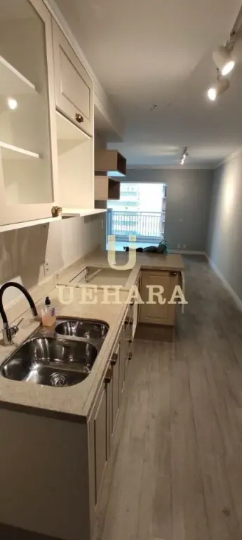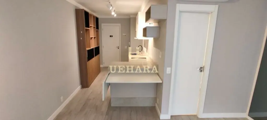 Apartamento de 42m², mobiliado, com box, armários nos banheiros e cozinha, ar condicionado, chuveiro a gás, meses e cadeiras de escritório, quarto (01) e corredor com portas amplas e área de serviço .