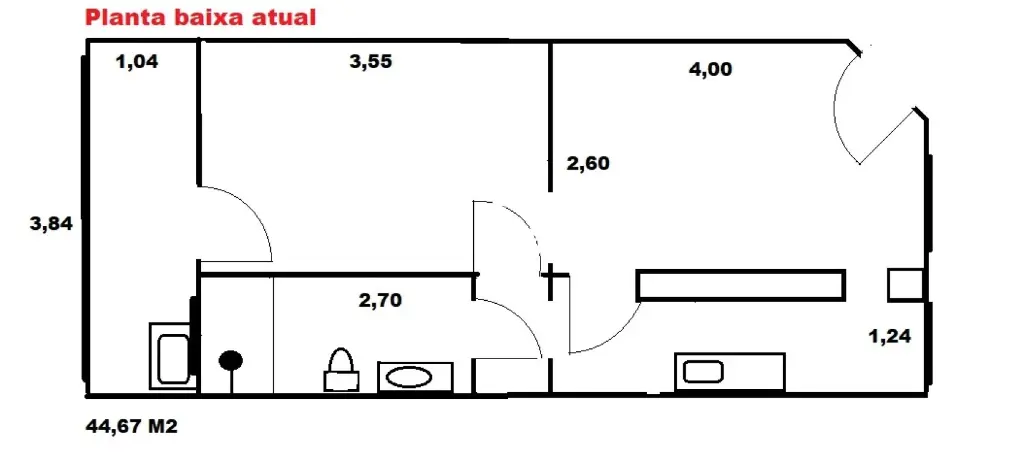 Apartamento com 1 dormitório, 1 banheiro, cozinha, sala, área de serviço.