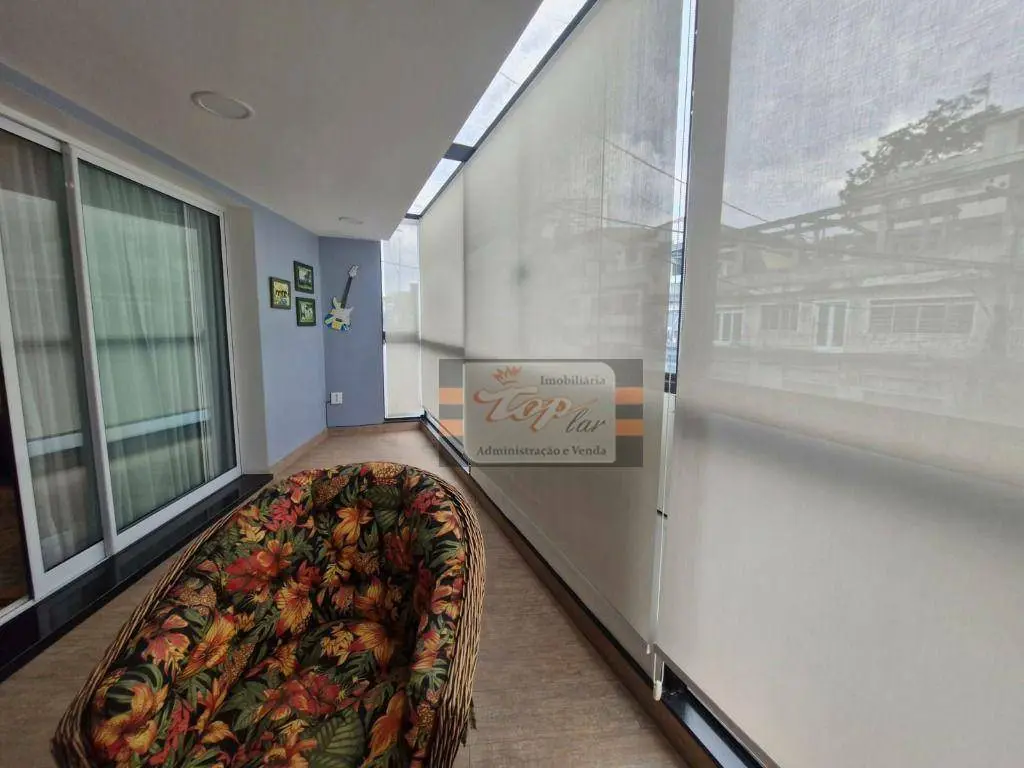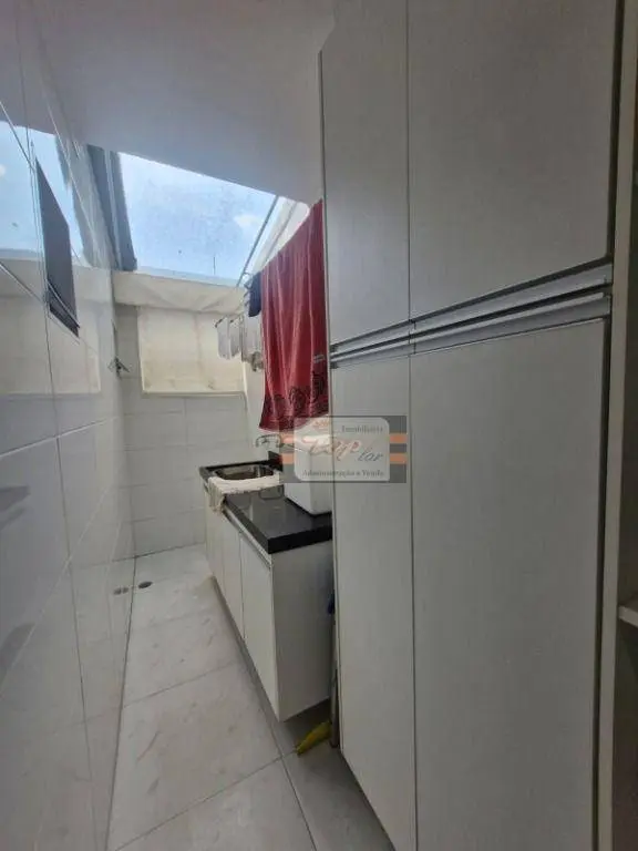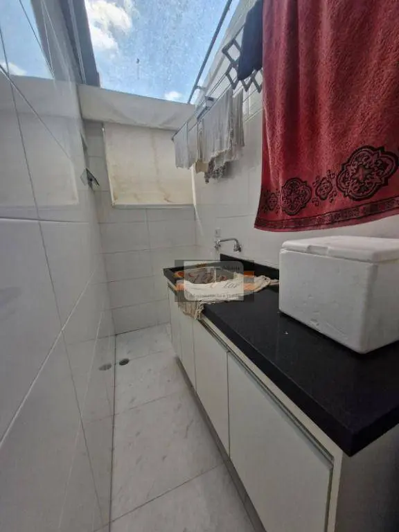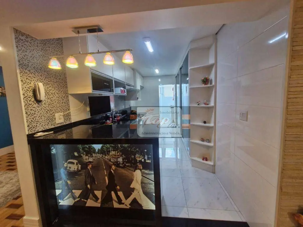 Sala para 2 ambientes com varanda, 2 quartos sendo 1 suíte, cozinha, área de serviço, 2 banheiros no total.