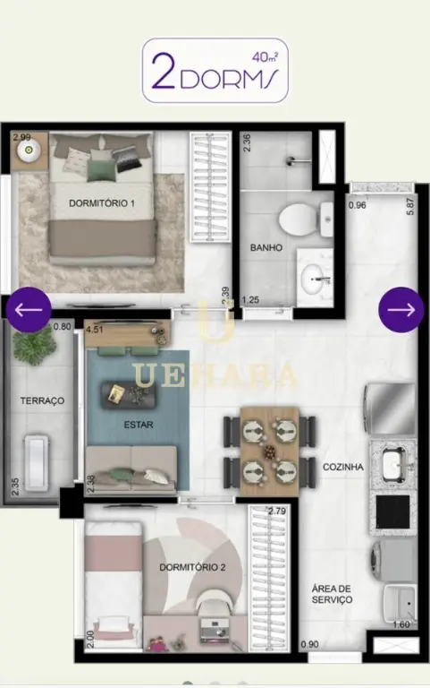 Imóvel novo com 40m², 02 dormitórios, sala, cozinha, área de serviço, 01 banheiro e SEM vaga de garagem.
