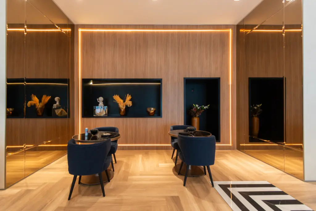 Hall social elegante com banheiro masculino e feminino