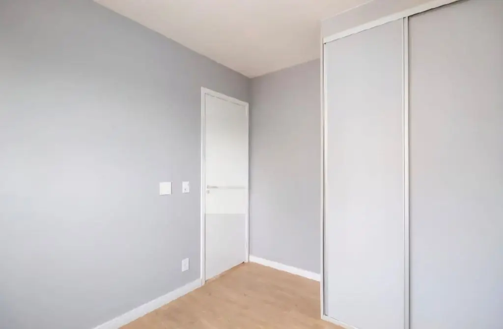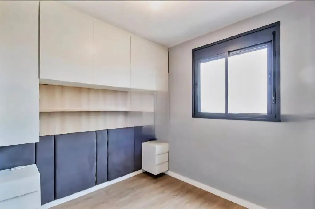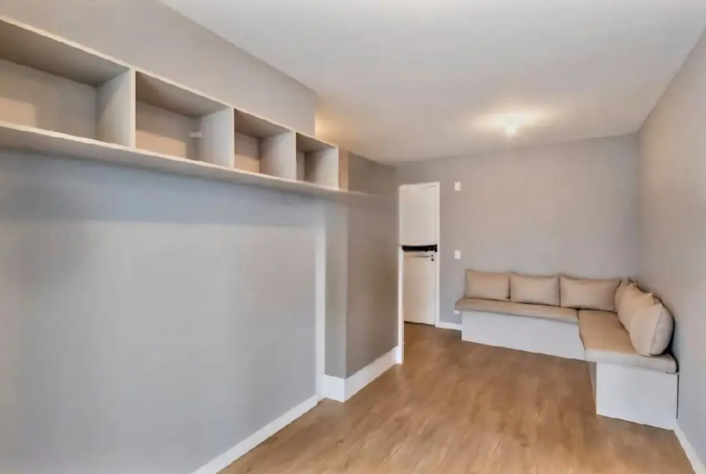 Bancada de Quartzo Branco na Divisa entre a cozinha e sala com armário.