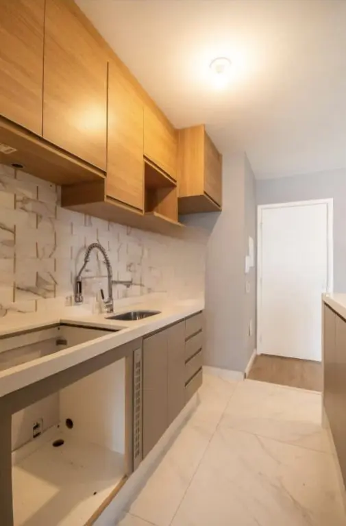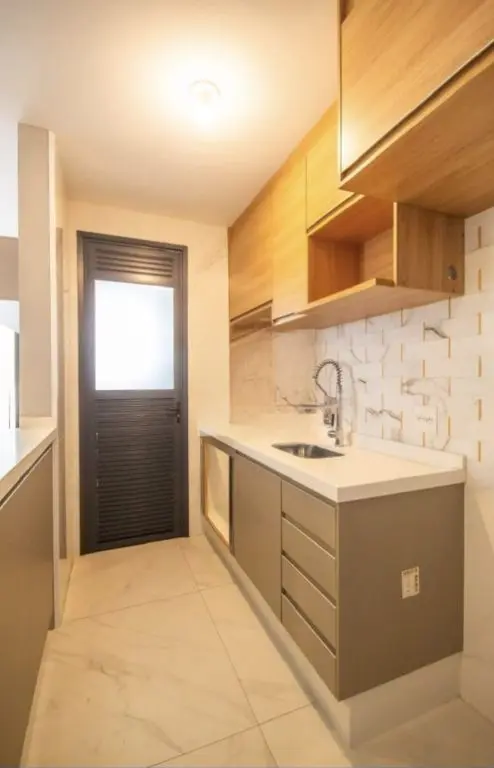 Pia em Quartzo Branco na Cozinha extensiva até a varanda.