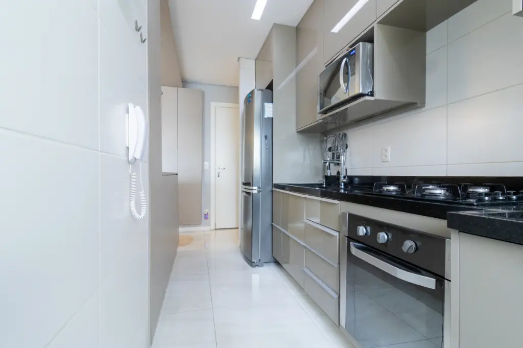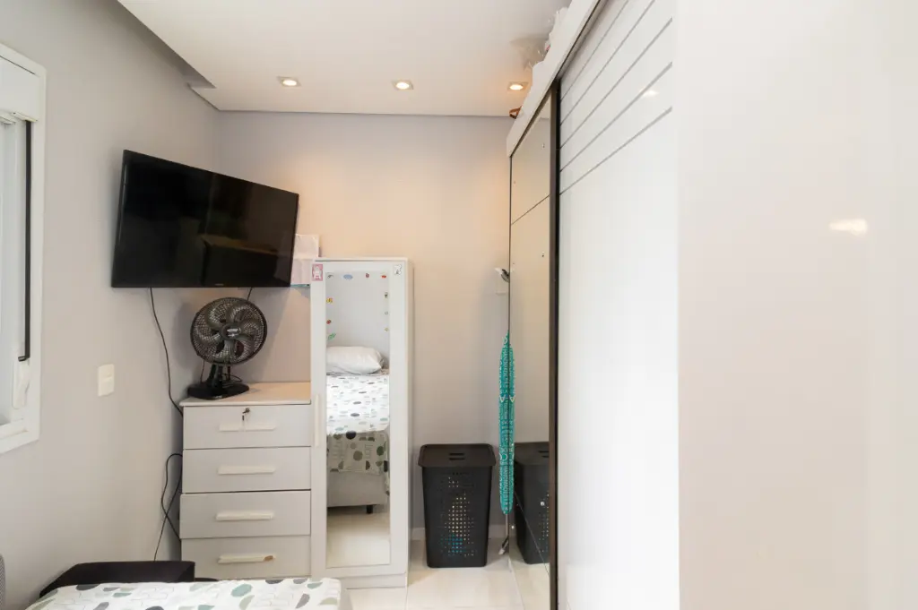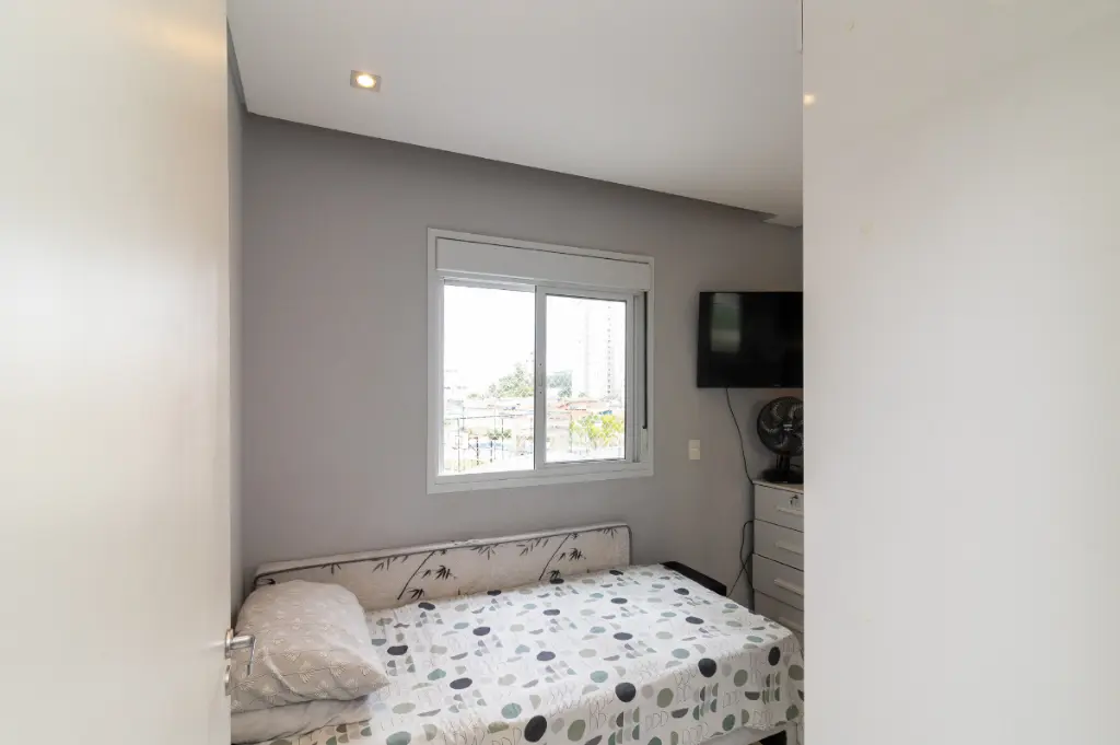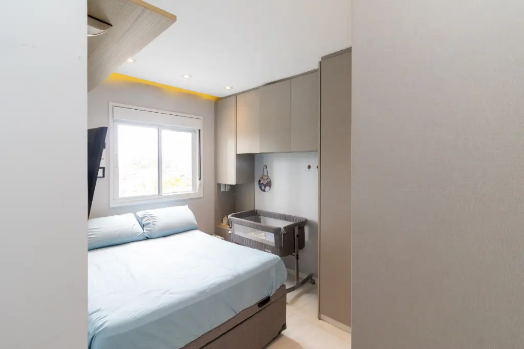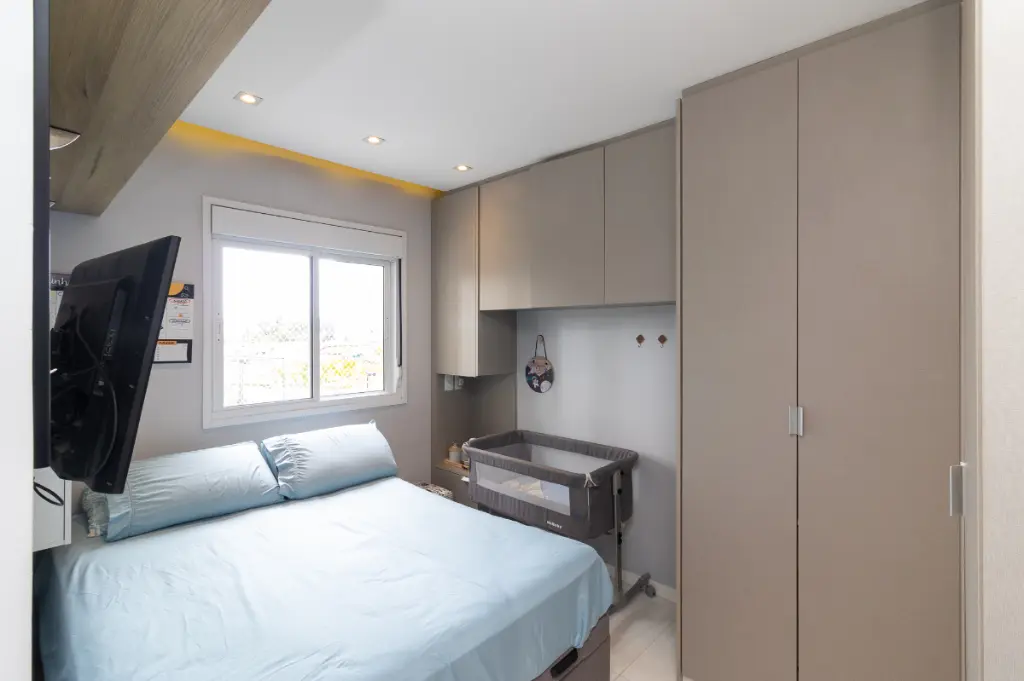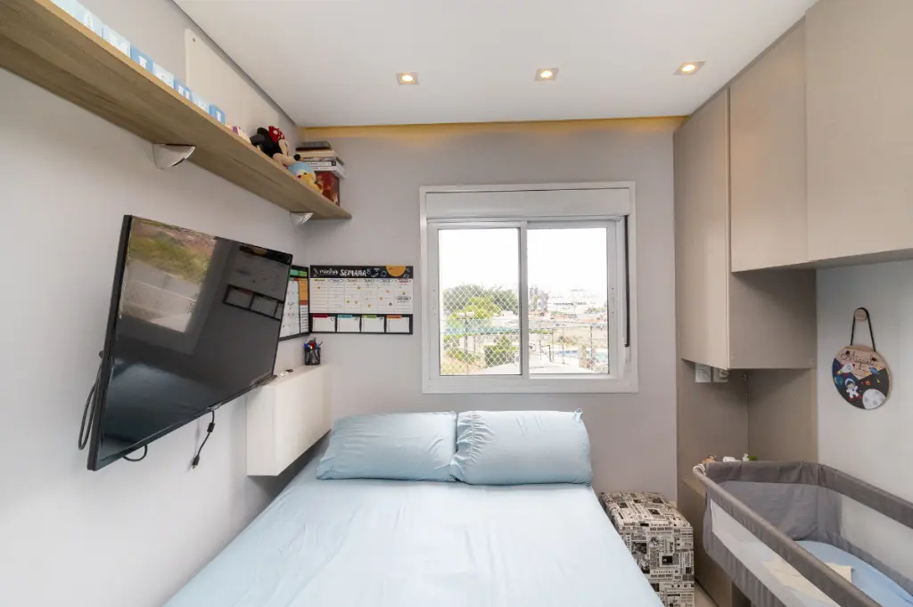 O apartamento possui 2 quartos, sendo 1 suíte, e 1 banheiros bem distribuídos para acomodar sua família com total conforto. A sala de estar e a cozinha são integradas, proporcionando um ambiente amplo e arejado, ideal para momentos de convivência. Os móveis planejados e o piso porcelanato valorizam ainda mais o espaço, enquanto a sacada oferece uma vista permanente.