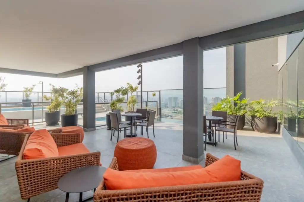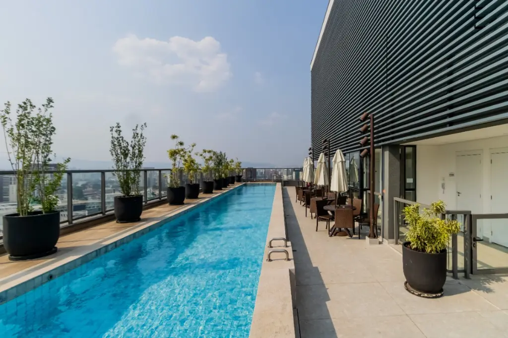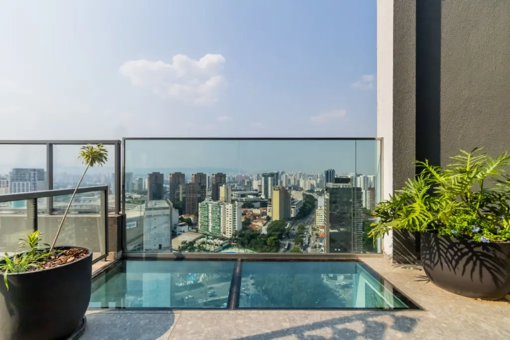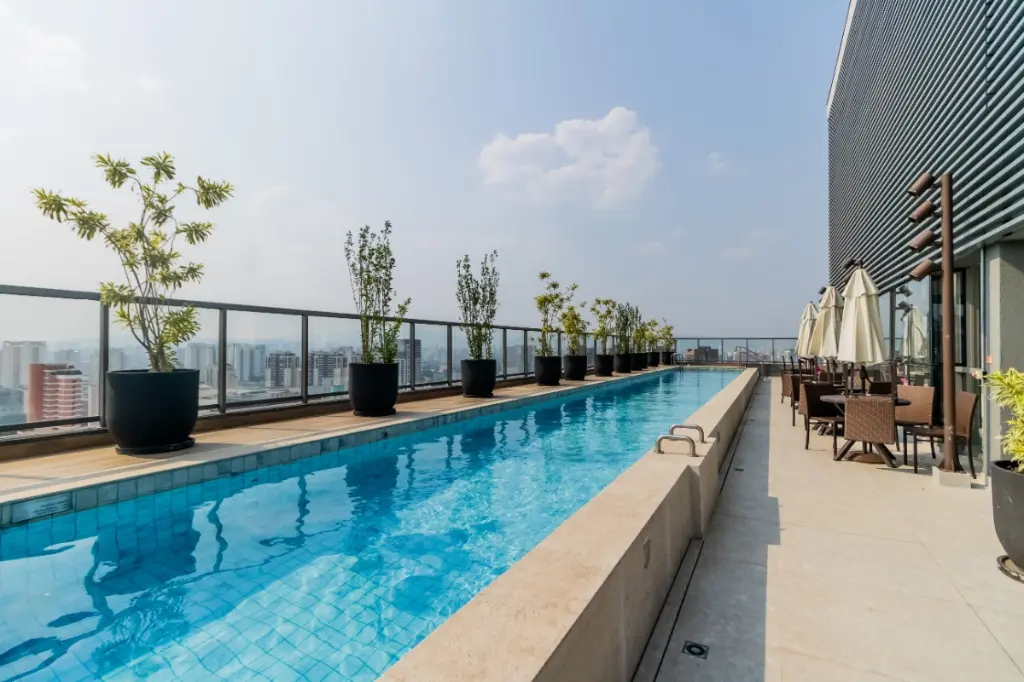 Lazer espetacular na cobertura: piscina, ampla área para fitness, lounge e mirante.