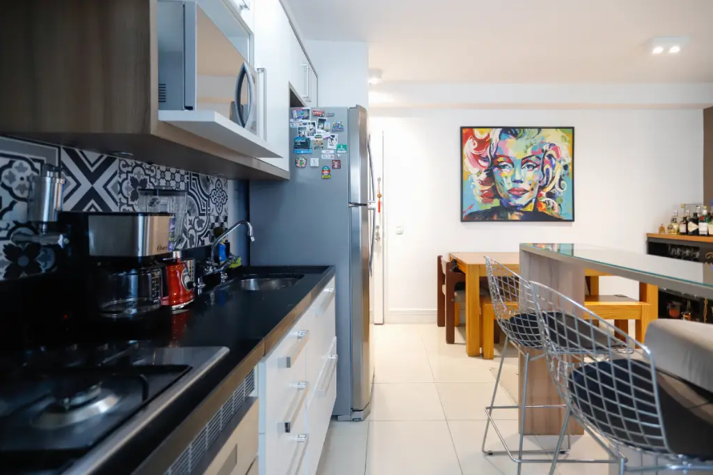 Cozinha integrada e varanda bem espaçosa