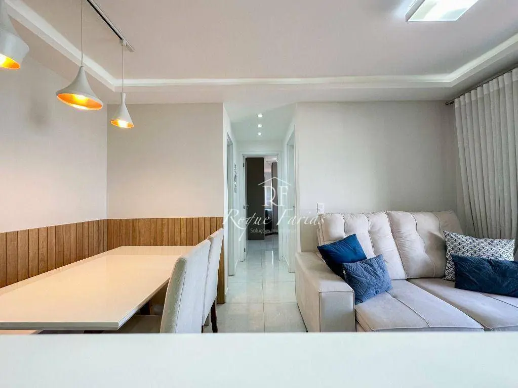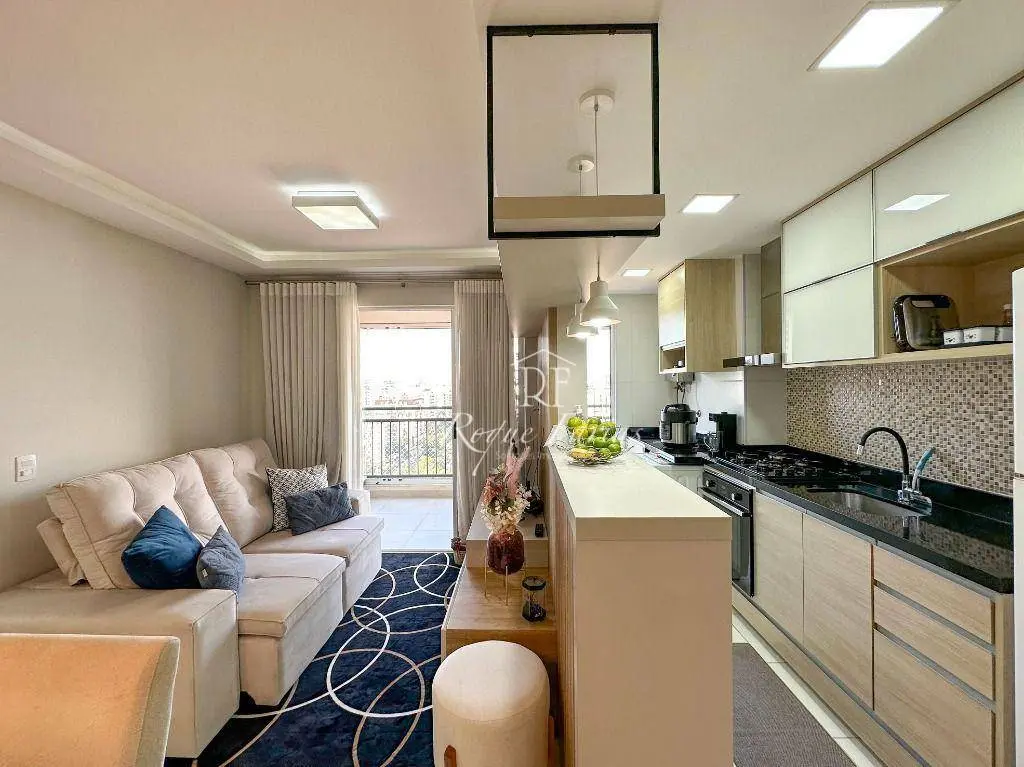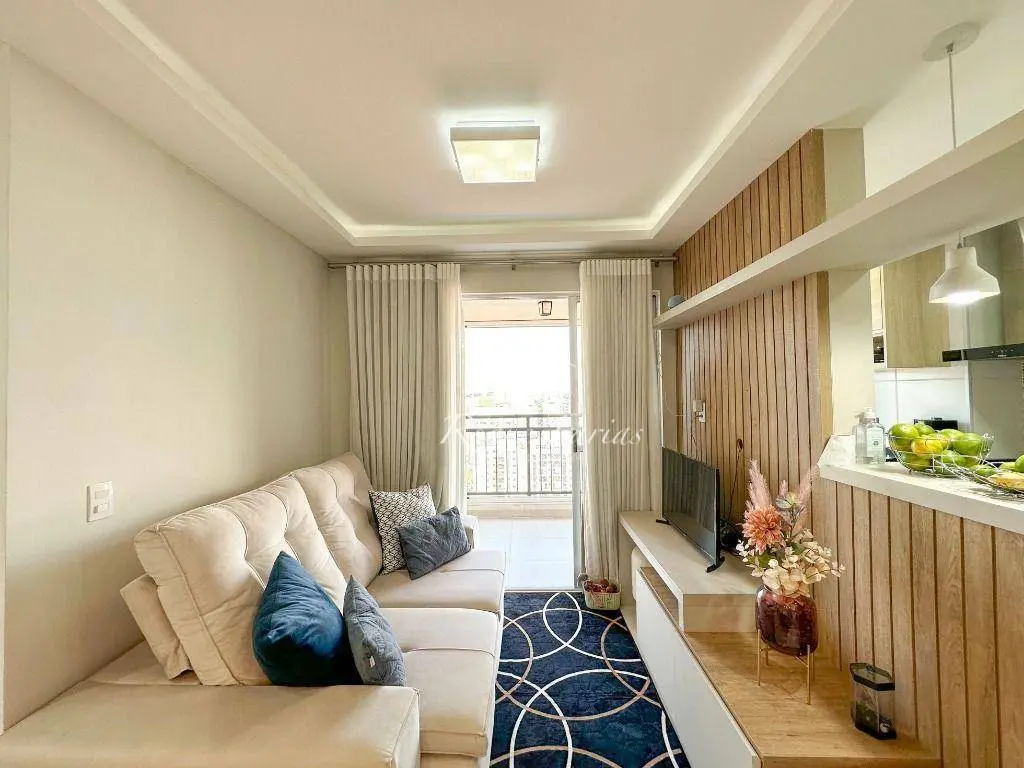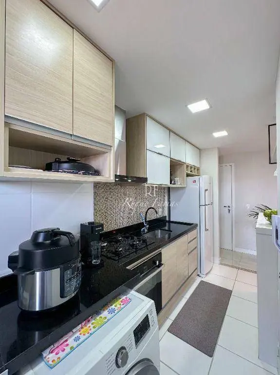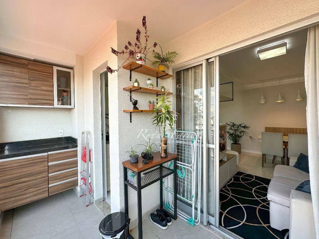 Em 62m2 muito bem distribuídos o imóvel conta com sala para 2 ambientes já mobiliada com mesa, cadeiras e rack para TV, varanda gourmet envidraçada, 2 dormitórios com armários sendo 1 suíte, banheiro social, lavanderia e piso em porcelanato, além de cozinha completa com armários, fogão, forno e geladeira.