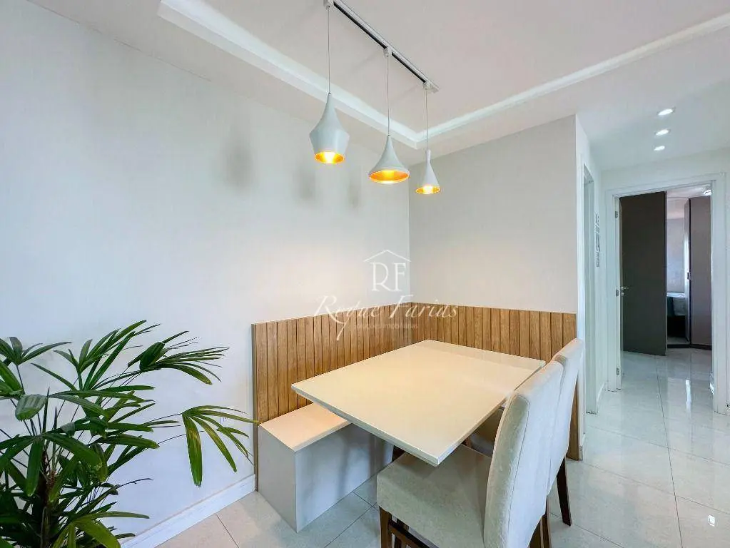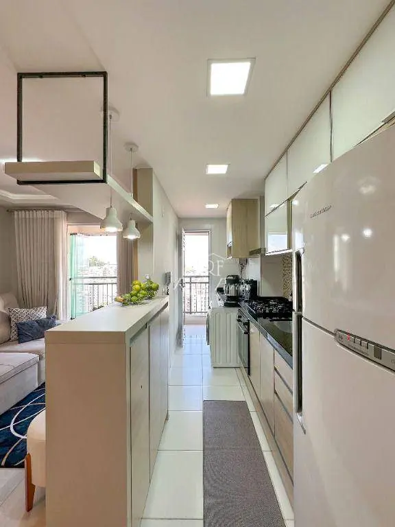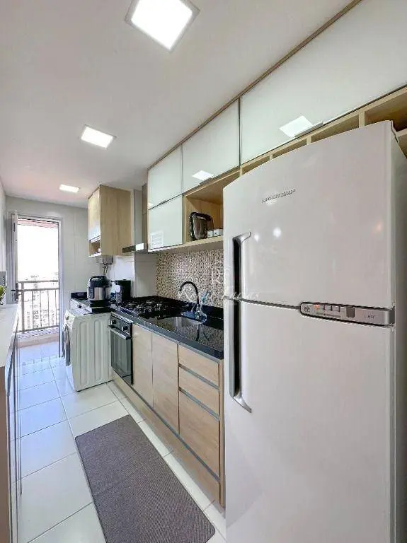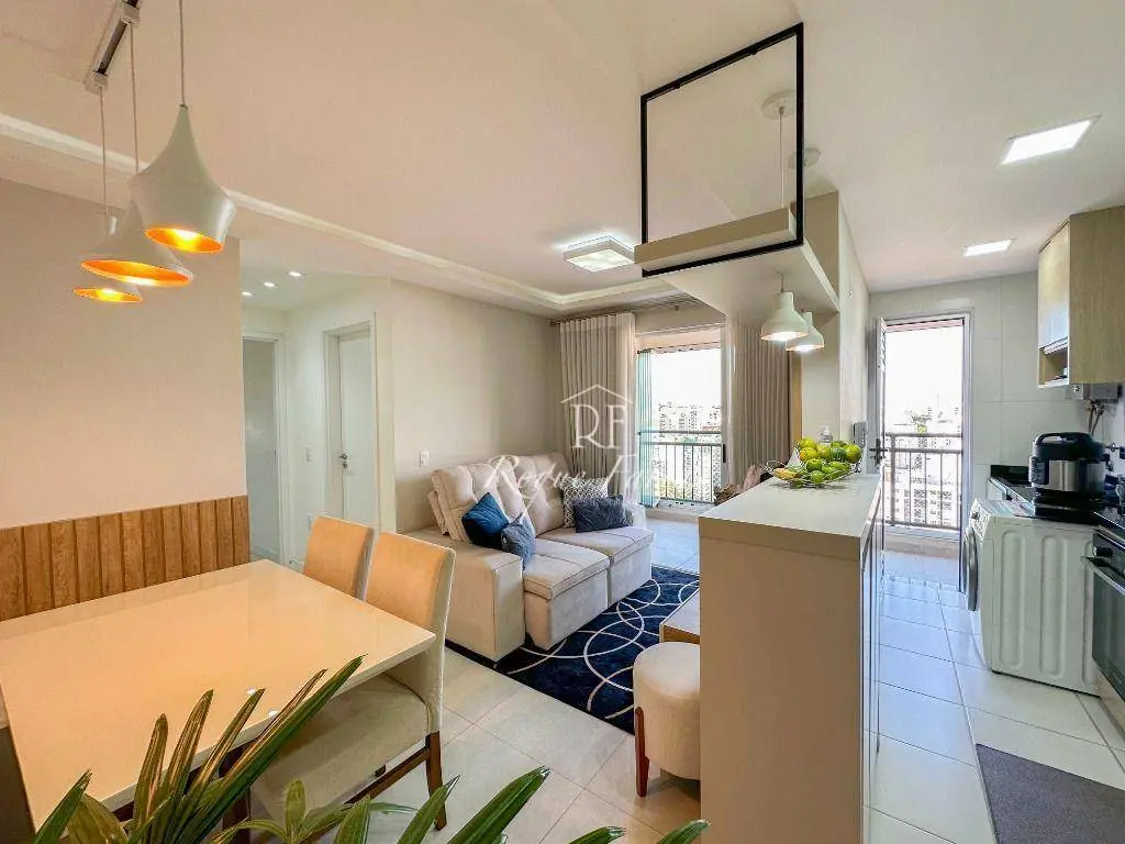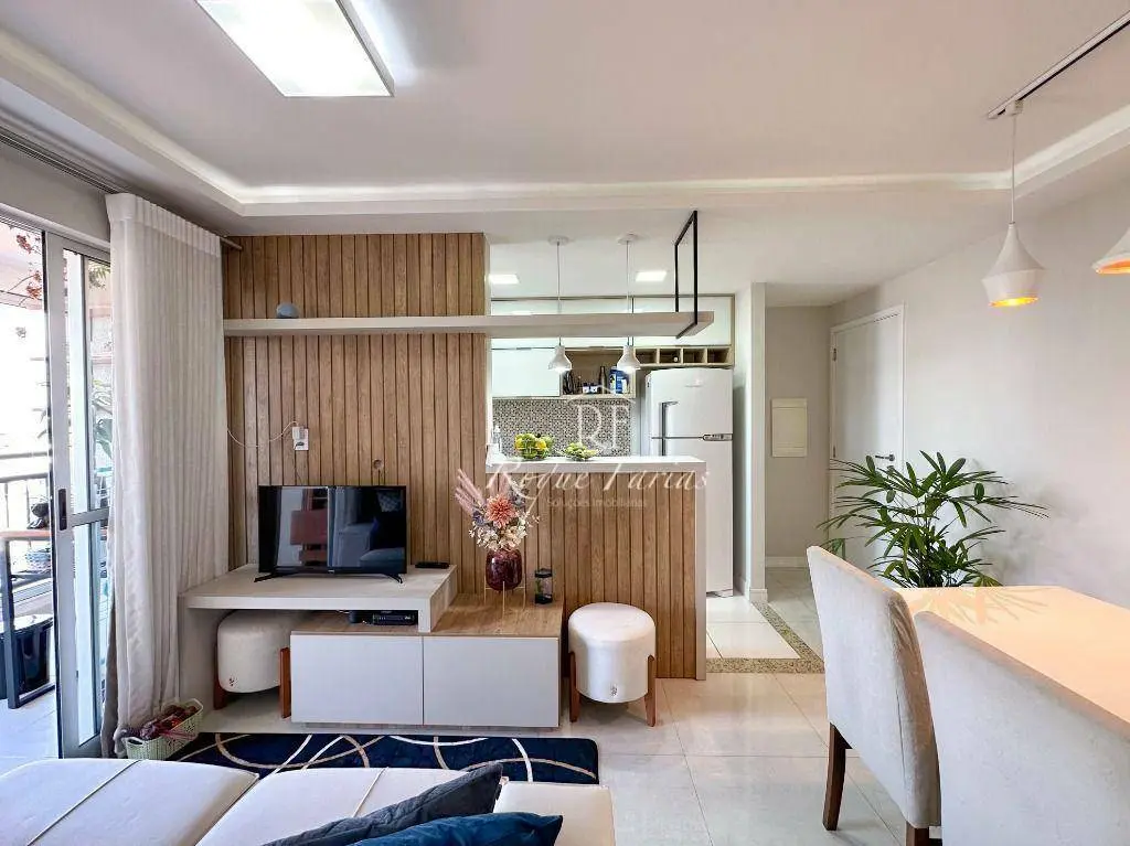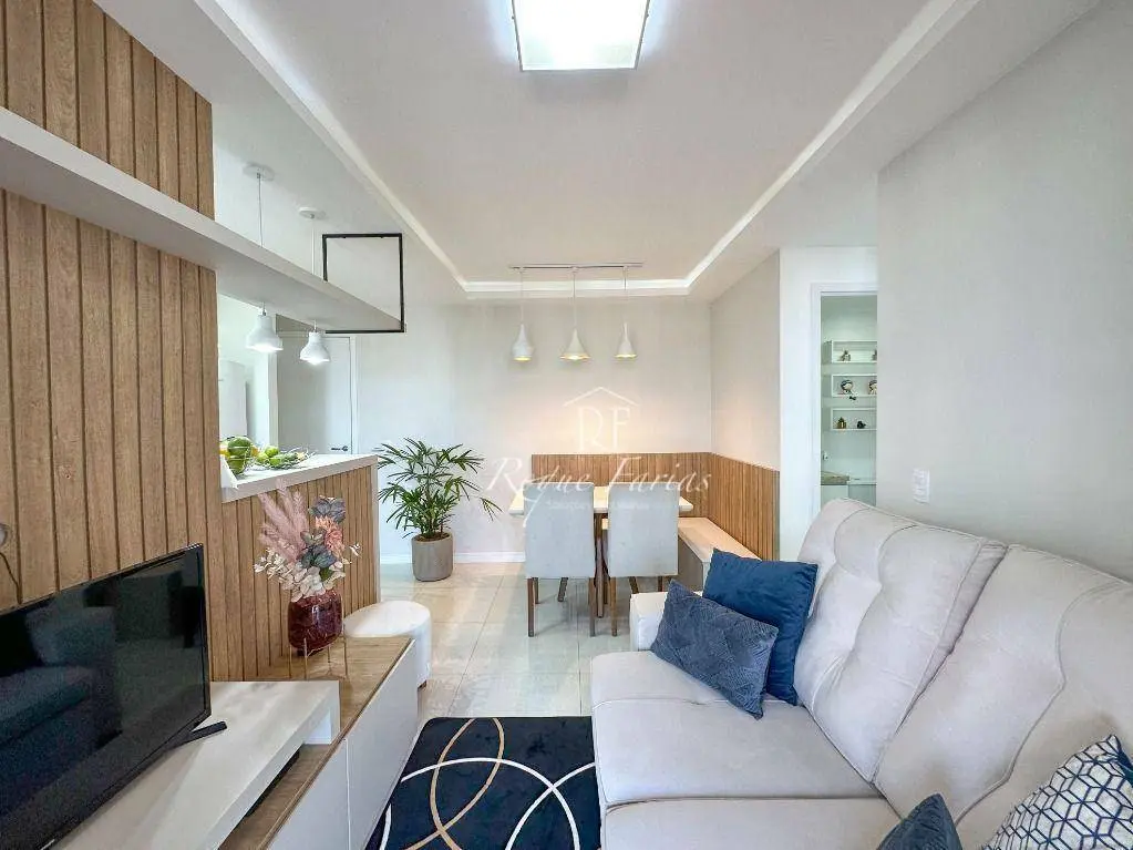 Em 62m2 muito bem distribuídos o imóvel conta com sala para 2 ambientes já mobiliada com mesa, cadeiras e rack para TV, varanda gourmet envidraçada, 2 dormitórios com armários sendo 1 suíte, banheiro social, lavanderia e piso em porcelanato, além de cozinha completa com armários, fogão, forno e geladeira.